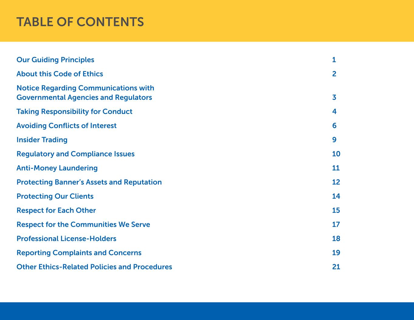 TABLE OF CONTENTS Our Guiding Principles 1 About this Code of Ethics 2 Notice Regarding Communications with Governmental Agencies and Regulators 3 Taking Responsibility for Conduct 4 Avoiding Conflicts of Interest 6 Insider Trading 9 Regulatory and Compliance Issues 10 Anti-Money Laundering 11 Protecting Banner’s Assets and Reputation 12 Protecting Our Clients 14 Respect for Each Other 15 Respect for the Communities We Serve 17 Professional License-Holders 18 Reporting Complaints and Concerns 19 Other Ethics-Related Policies and Procedures 21