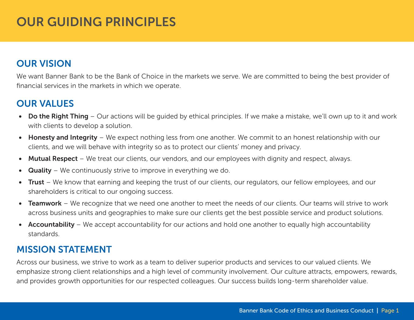 OUR GUIDING PRINCIPLES OUR VISION We want Banner Bank to be the Bank of Choice in the markets we serve. We are committed to being the best provider of financial services in the markets in which we operate. OUR VALUES • Do the Right Thing – Our actions will be guided by ethical principles. If we make a mistake, we’ll own up to it and work with clients to develop a solution. • Honesty and Integrity – We expect nothing less from one another. We commit to an honest relationship with our clients, and we will behave with integrity so as to protect our clients’ money and privacy. • Mutual Respect – We treat our clients, our vendors, and our employees with dignity and respect, always. • Quality – We continuously strive to improve in everything we do. • Trust – We know that earning and keeping the trust of our clients, our regulators, our fellow employees, and our shareholders is critical to our ongoing success. • Teamwork – We recognize that we need one another to meet the needs of our clients. Our teams will strive to work across business units and geographies to make sure our clients get the best possible service and product solutions. • Accountability – We accept accountability for our actions and hold one another to equally high accountability standards. MISSION STATEMENT Across our business, we strive to work as a team to deliver superior products and services to our valued clients. We emphasize strong client relationships and a high level of community involvement. Our culture attracts, empowers, rewards, and provides growth opportunities for our respected colleagues. Our success builds long-term shareholder value. Banner Bank Code of Ethics and Business Conduct | Page 1