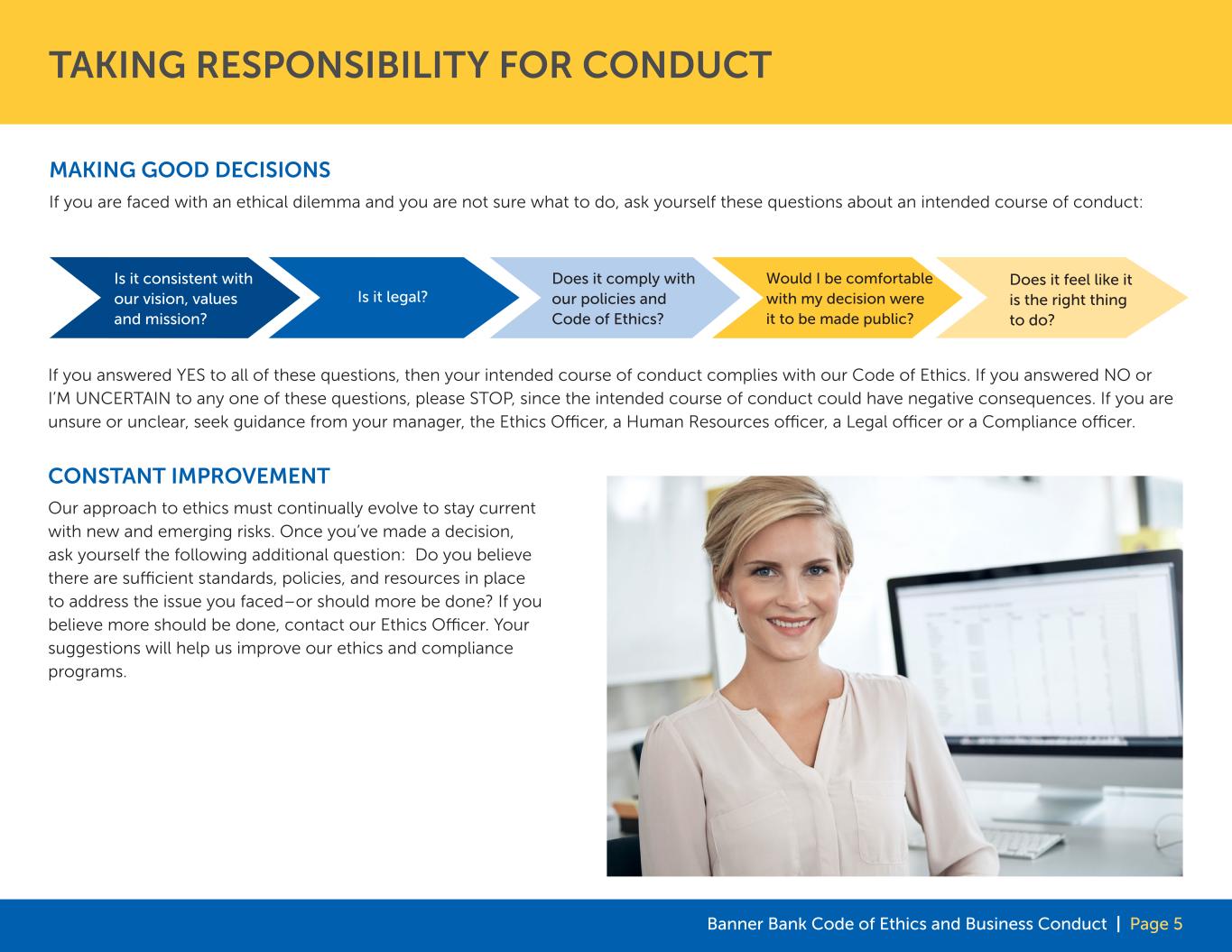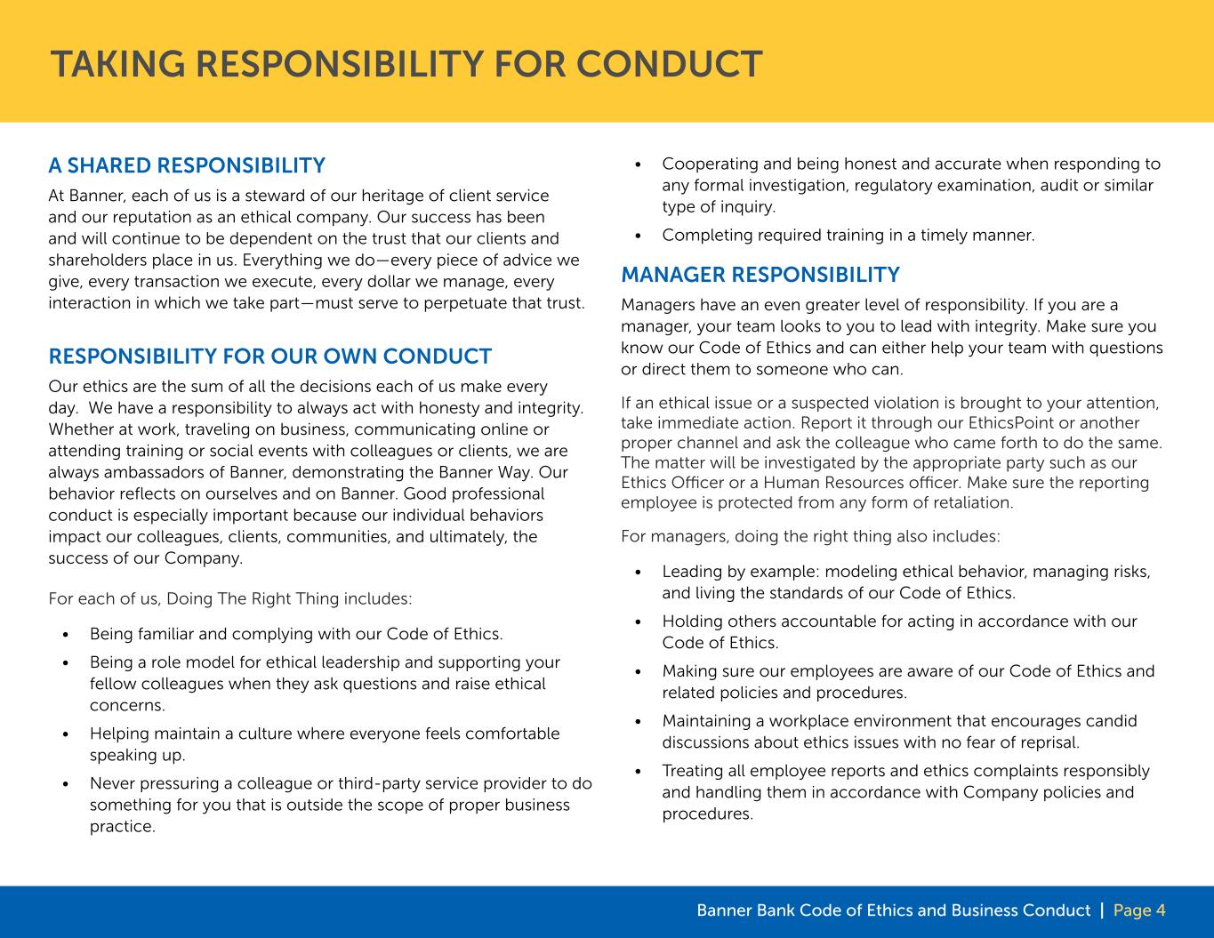 TAKING RESPONSIBILITY FOR CONDUCT A SHARED RESPONSIBILITY At Banner, each of us is a steward of our heritage of client service and our reputation as an ethical company. Our success has been and will continue to be dependent on the trust that our clients and shareholders place in us. Everything we do—every piece of advice we give, every transaction we execute, every dollar we manage, every interaction in which we take part—must serve to perpetuate that trust. RESPONSIBILITY FOR OUR OWN CONDUCT Our ethics are the sum of all the decisions each of us make every day. We have a responsibility to always act with honesty and integrity. Whether at work, traveling on business, communicating online or attending training or social events with colleagues or clients, we are always ambassadors of Banner, demonstrating the Banner Way. Our behavior reflects on ourselves and on Banner. Good professional conduct is especially important because our individual behaviors impact our colleagues, clients, communities, and ultimately, the success of our Company. For each of us, Doing The Right Thing includes: • Being familiar and complying with our Code of Ethics. • Being a role model for ethical leadership and supporting your fellow colleagues when they ask questions and raise ethical concerns. • Helping maintain a culture where everyone feels comfortable speaking up. • Never pressuring a colleague or third-party service provider to do something for you that is outside the scope of proper business practice. • Cooperating and being honest and accurate when responding to any formal investigation, regulatory examination, audit or similar type of inquiry. • Completing required training in a timely manner. MANAGER RESPONSIBILITY Managers have an even greater level of responsibility. If you are a manager, your team looks to you to lead with integrity. Make sure you know our Code of Ethics and can either help your team with questions or direct them to someone who can. If an ethical issue or a suspected violation is brought to your attention, take immediate action. Report it through our EthicsPoint or another proper channel and ask the colleague who came forth to do the same. The matter will be investigated by the appropriate party such as our Ethics Officer or a Human Resources officer. Make sure the reporting employee is protected from any form of retaliation. For managers, doing the right thing also includes: • Leading by example: modeling ethical behavior, managing risks, and living the standards of our Code of Ethics. • Holding others accountable for acting in accordance with our Code of Ethics. • Making sure our employees are aware of our Code of Ethics and related policies and procedures. • Maintaining a workplace environment that encourages candid discussions about ethics issues with no fear of reprisal. • Treating all employee reports and ethics complaints responsibly and handling them in accordance with Company policies and procedures. Banner Bank Code of Ethics and Business Conduct | Page 4
