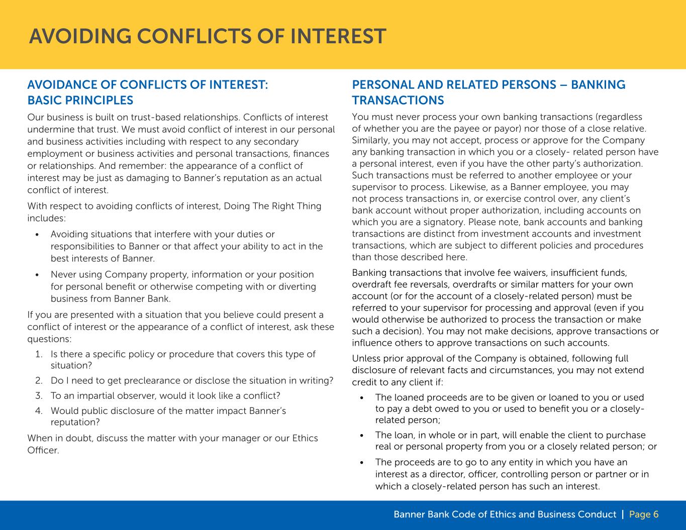 AVOIDING CONFLICTS OF INTEREST AVOIDANCE OF CONFLICTS OF INTEREST: BASIC PRINCIPLES Our business is built on trust-based relationships. Conflicts of interest undermine that trust. We must avoid conflict of interest in our personal and business activities including with respect to any secondary employment or business activities and personal transactions, finances or relationships. And remember: the appearance of a conflict of interest may be just as damaging to Banner’s reputation as an actual conflict of interest. With respect to avoiding conflicts of interest, Doing The Right Thing includes: • Avoiding situations that interfere with your duties or responsibilities to Banner or that affect your ability to act in the best interests of Banner. • Never using Company property, information or your position for personal benefit or otherwise competing with or diverting business from Banner Bank. If you are presented with a situation that you believe could present a conflict of interest or the appearance of a conflict of interest, ask these questions: 1. Is there a specific policy or procedure that covers this type of situation? 2. Do I need to get preclearance or disclose the situation in writing? 3. To an impartial observer, would it look like a conflict? 4. Would public disclosure of the matter impact Banner’s reputation? When in doubt, discuss the matter with your manager or our Ethics Officer. PERSONAL AND RELATED PERSONS – BANKING TRANSACTIONS You must never process your own banking transactions (regardless of whether you are the payee or payor) nor those of a close relative. Similarly, you may not accept, process or approve for the Company any banking transaction in which you or a closely- related person have a personal interest, even if you have the other party’s authorization. Such transactions must be referred to another employee or your supervisor to process. Likewise, as a Banner employee, you may not process transactions in, or exercise control over, any client’s bank account without proper authorization, including accounts on which you are a signatory. Please note, bank accounts and banking transactions are distinct from investment accounts and investment transactions, which are subject to different policies and procedures than those described here. Banking transactions that involve fee waivers, insufficient funds, overdraft fee reversals, overdrafts or similar matters for your own account (or for the account of a closely-related person) must be referred to your supervisor for processing and approval (even if you would otherwise be authorized to process the transaction or make such a decision). You may not make decisions, approve transactions or influence others to approve transactions on such accounts. Unless prior approval of the Company is obtained, following full disclosure of relevant facts and circumstances, you may not extend credit to any client if: • The loaned proceeds are to be given or loaned to you or used to pay a debt owed to you or used to benefit you or a closely- related person; • The loan, in whole or in part, will enable the client to purchase real or personal property from you or a closely related person; or • The proceeds are to go to any entity in which you have an interest as a director, officer, controlling person or partner or in which a closely-related person has such an interest. Banner Bank Code of Ethics and Business Conduct | Page 6