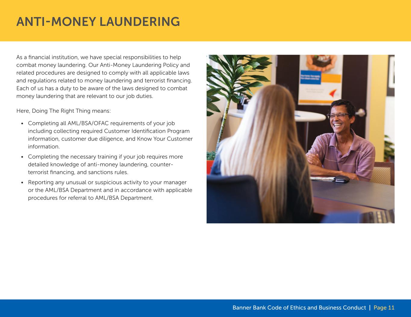ANTI-MONEY LAUNDERING As a financial institution, we have special responsibilities to help combat money laundering. Our Anti-Money Laundering Policy and related procedures are designed to comply with all applicable laws and regulations related to money laundering and terrorist financing. Each of us has a duty to be aware of the laws designed to combat money laundering that are relevant to our job duties. Here, Doing The Right Thing means: • Completing all AML/BSA/OFAC requirements of your job including collecting required Customer Identification Program information, customer due diligence, and Know Your Customer information. • Completing the necessary training if your job requires more detailed knowledge of anti-money laundering, counter- terrorist financing, and sanctions rules. • Reporting any unusual or suspicious activity to your manager or the AML/BSA Department and in accordance with applicable procedures for referral to AML/BSA Department. Banner Bank Code of Ethics and Business Conduct | Page 11