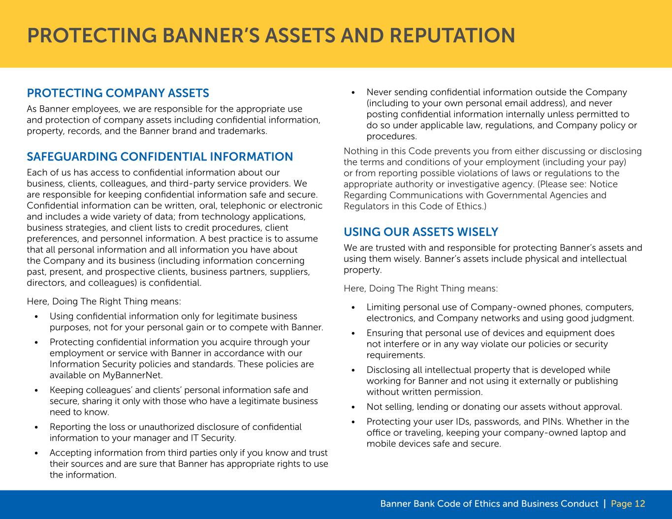 PROTECTING BANNER’S ASSETS AND REPUTATION PROTECTING COMPANY ASSETS As Banner employees, we are responsible for the appropriate use and protection of company assets including confidential information, property, records, and the Banner brand and trademarks. SAFEGUARDING CONFIDENTIAL INFORMATION Each of us has access to confidential information about our business, clients, colleagues, and third-party service providers. We are responsible for keeping confidential information safe and secure. Confidential information can be written, oral, telephonic or electronic and includes a wide variety of data; from technology applications, business strategies, and client lists to credit procedures, client preferences, and personnel information. A best practice is to assume that all personal information and all information you have about the Company and its business (including information concerning past, present, and prospective clients, business partners, suppliers, directors, and colleagues) is confidential. Here, Doing The Right Thing means: • Using confidential information only for legitimate business purposes, not for your personal gain or to compete with Banner. • Protecting confidential information you acquire through your employment or service with Banner in accordance with our Information Security policies and standards. These policies are available on MyBannerNet. • Keeping colleagues’ and clients’ personal information safe and secure, sharing it only with those who have a legitimate business need to know. • Reporting the loss or unauthorized disclosure of confidential information to your manager and IT Security. • Accepting information from third parties only if you know and trust their sources and are sure that Banner has appropriate rights to use the information. • Never sending confidential information outside the Company (including to your own personal email address), and never posting confidential information internally unless permitted to do so under applicable law, regulations, and Company policy or procedures. Nothing in this Code prevents you from either discussing or disclosing the terms and conditions of your employment (including your pay) or from reporting possible violations of laws or regulations to the appropriate authority or investigative agency. (Please see: Notice Regarding Communications with Governmental Agencies and Regulators in this Code of Ethics.) USING OUR ASSETS WISELY We are trusted with and responsible for protecting Banner’s assets and using them wisely. Banner’s assets include physical and intellectual property. Here, Doing The Right Thing means: • Limiting personal use of Company-owned phones, computers, electronics, and Company networks and using good judgment. • Ensuring that personal use of devices and equipment does not interfere or in any way violate our policies or security requirements. • Disclosing all intellectual property that is developed while working for Banner and not using it externally or publishing without written permission. • Not selling, lending or donating our assets without approval. • Protecting your user IDs, passwords, and PINs. Whether in the office or traveling, keeping your company-owned laptop and mobile devices safe and secure. Banner Bank Code of Ethics and Business Conduct | Page 12