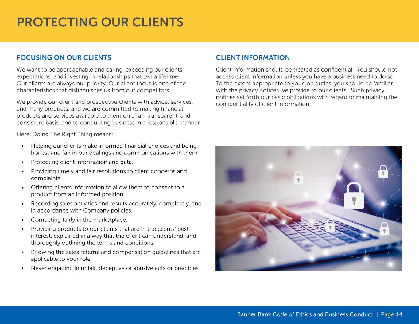 PROTECTING OUR CLIENTS FOCUSING ON OUR CLIENTS We want to be approachable and caring, exceeding our clients’ expectations, and investing in relationships that last a lifetime. Our clients are always our priority. Our client focus is one of the characteristics that distinguishes us from our competitors. We provide our client and prospective clients with advice, services, and many products, and we are committed to making financial products and services available to them on a fair, transparent, and consistent basis, and to conducting business in a responsible manner. Here, Doing The Right Thing means: • Helping our clients make informed financial choices and being honest and fair in our dealings and communications with them. • Protecting client information and data. • Providing timely and fair resolutions to client concerns and complaints. • Offering clients information to allow them to consent to a product from an informed position. • Recording sales activities and results accurately, completely, and in accordance with Company policies. • Competing fairly in the marketplace. • Providing products to our clients that are in the clients’ best interest, explained in a way that the client can understand, and thoroughly outlining the terms and conditions. • Knowing the sales referral and compensation guidelines that are applicable to your role. • Never engaging in unfair, deceptive or abusive acts or practices. CLIENT INFORMATION Client information should be treated as confidential. You should not access client information unless you have a business need to do so. To the extent appropriate to your job duties, you should be familiar with the privacy notices we provide to our clients. Such privacy notices set forth our basic obligations with regard to maintaining the confidentiality of client information. Banner Bank Code of Ethics and Business Conduct | Page 14