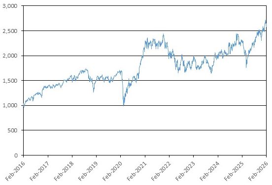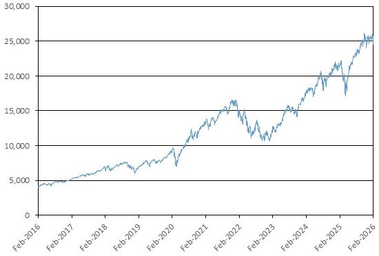 The graph below illustrates the performance of SPX from February 5, 2016 through February 5, 2026.