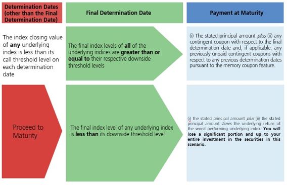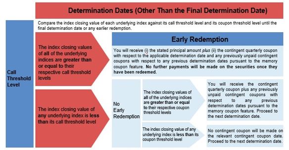 levels, the securities will be automatically redeemed for an amount per security equal to the early redemption payment on the first contingent coupon payment date immediately following the related determination date. No further payments