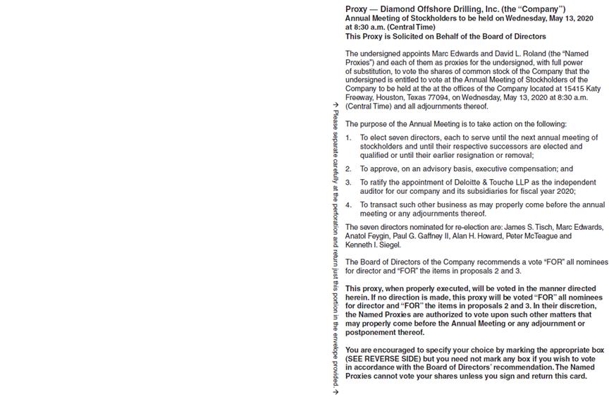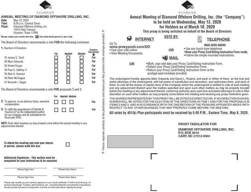 Annual Meeting of Diamond Offshore Drilling, Inc. (the “Company”) to be held on Wednesday, May 13, 2020 for Holders as of March 18, 2020 This proxy is being solicited on behalf of the Board of Directors INTERNET VOTE BY: TELEPHONE Call Go To 866-895-6890 www.proxypush.com/DO • Use any touch-tone telephone. • Cast your vote online. OR • Have your Proxy Card/Voting Instruction Form ready. • View Meeting Documents. • Follow the simple recorded instructions. MAIL OR • Mark, sign and date your Proxy Card/Voting Instruction Form. • Detach your Proxy Card/Voting Instruction Form. • Return your Proxy Card/Voting Instruction Form in the postage-paid envelope provided. The undersigned hereby appoints Marc Edwards and David L. Roland, and each or either of them, as the true and lawful attorneys of the undersigned, with full power of substitution and revocation, and authorizes them, and each of them, to vote all the shares of capital stock of the Company which the undersigned is entitled to vote at said meeting and any adjournment thereof upon the matters specified and upon such other matters as may be properly brought before the meeting or any adjournment thereof, conferring authority upon such true and lawful attorneys to vote in their discretion on such other matters as may properly come before the meeting and revoking any proxy heretofore given. THE SHARES REPRESENTED BY THIS PROXY WILL BE VOTED AS DIRECTED OR, IF NO DIRECTION IS GIVEN, SHARES WILL BE VOTED FOR THE ELECTION OF THE DIRECTORS IN ITEM 1 AND FOR THE PROPOSALS IN ITEMS 2 AND 3, AND IN ACCORDANCE WITH THE DISCRETION OF THE PERSONS APPOINTED ABOVE WITH RESPECT TO ANY OTHER BUSINESS THAT MAY PROPERLY COME BEFORE THE MEETING. All votes by 401(k) Plan participants must be received by 5:00 P.M., Eastern Time, May 8, 2020. PROXY TABULATOR FOR DIAMOND OFFSHORE DRILLING, INC. P.O. BOX 8016 CARY, NC 27512-9903 Please separate carefully at the perforation and return just this portion in the envelope provided. Proxy — Diamond Offshore Drilling, Inc. (the “Company”) Annual Meeting of Stockholders to be held on Wednesday, May 13, 2020 at 8:30 a.m. (Central Time) This Proxy is Solicited on Behalf of the Board of Directors The undersigned appoints Marc Edwards and David L. Roland (the “Named Proxies”) and each of them as proxies for the undersigned, with full power of substitution, to vote the shares of common stock of the Company that the undersigned is entitled to vote at the Annual Meeting of Stockholders of the Company to be held at the at the offices of the Company located at 15415 Katy Freeway, Houston, Texas 77094, on Wednesday, May 13, 2020 at 8:30 a.m. (Central Time) and all adjournments thereof. The purpose of the Annual Meeting is to take action on the following: 1. To elect seven directors, each to serve until the next annual meeting of stockholders and until their respective successors are elected and qualified or until their earlier resignation or removal; 2. To approve, on an advisory basis, executive compensation; and 3. To ratify the appointment of Deloitte & Touche LLP as the independent auditor for our company and its subsidiaries for fiscal year 2020; 4. To transact such other business as may properly come before the annual meeting or any adjournments thereof. The seven directors nominated for re-election are: James S. Tisch, Marc Edwards, Anatol Feygin, Paul G. Gaffney II, Alan H. Howard, Peter McTeague and Kenneth I. Siegel. The Board of Directors of the Company recommends a vote “FOR” all nominees for director and “FOR” the items in proposals 2 and 3. This proxy, when properly executed, will be voted in the manner directed herein. If no direction is made, this proxy will be voted “FOR” all nominees for director and “FOR” the items in proposals 2 and 3. In their discretion, the Named Proxies are authorized to vote upon such other matters that may properly come before the Annual Meeting or any adjournment or postponement thereof. You are encouraged to specify your choice by marking the appropriate box (SEE REVERSE SIDE) but you need not mark any box if you wish to vote in accordance with the Board of Directors’ recommendation. The Named Proxies cannot vote your shares unless you sign and return this card. Please separate carefully at the perforation and return just this portion in the envelope provided.