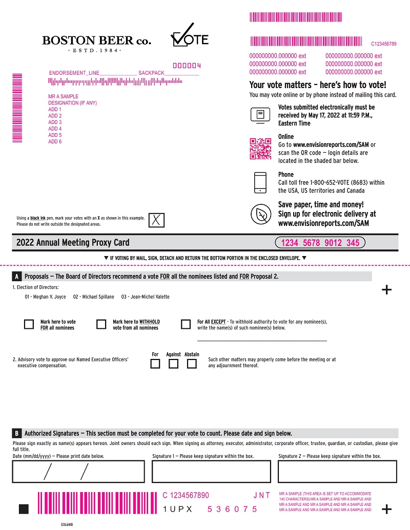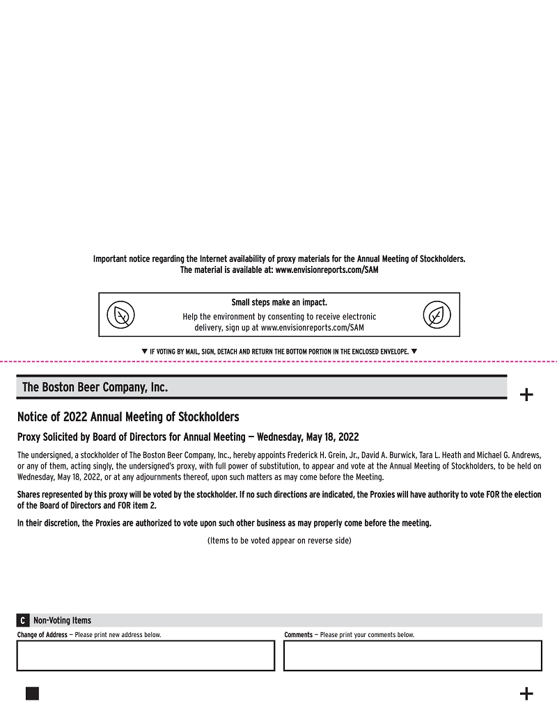 Your proxy is being solicited for the 2022 Annual Meeting of Stockholders of the Boston Beer Company, Inc. A Notice of the Online Availability of Proxy Materials has been mailed to all Stockholders of Record advising that they can: (1) view all Proxy Materials online; and (2) request a paper or email copy of the Proxy Materials free of charge. We encourage stockholders to access their Proxy Materials online to reduce the environmental impact and cost of our proxy solicitation.