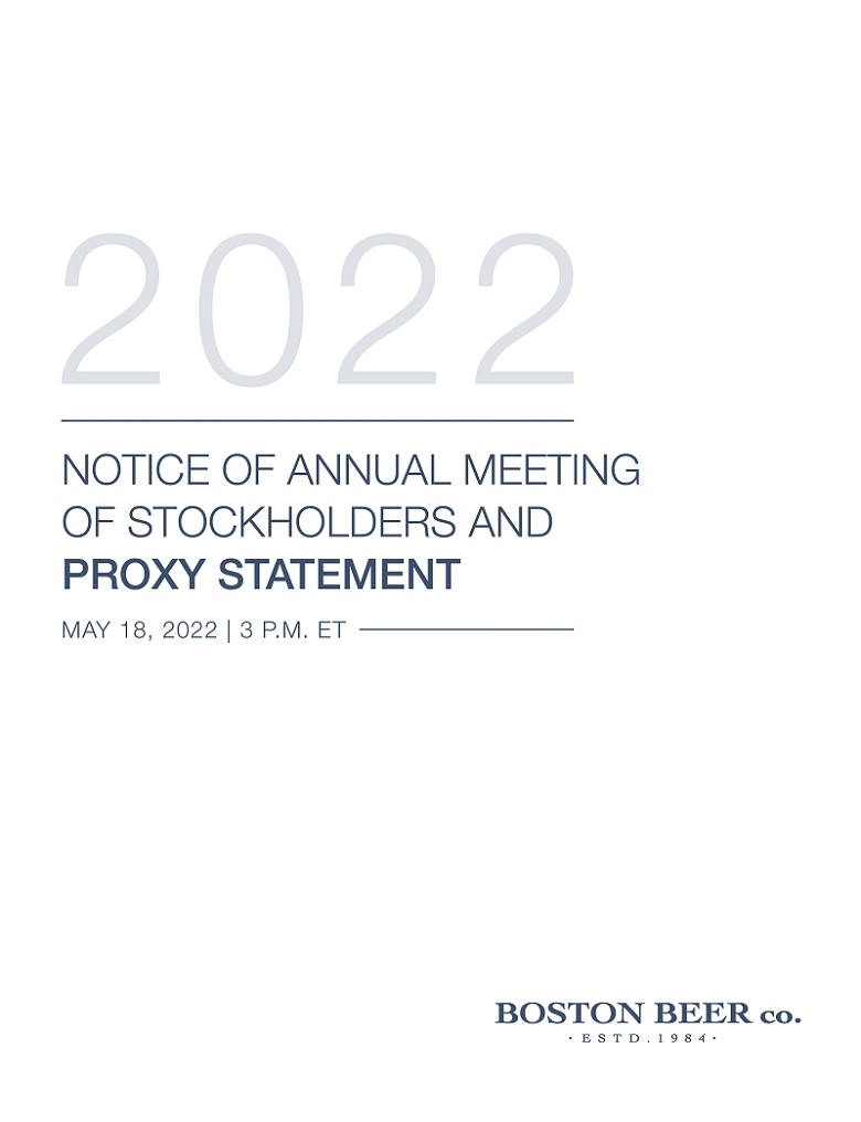 The Proxy Statement and Boston Beer’s Annual Report for the fiscal year ended December 25, 2021 are available at www.bostonbeer.com. On behalf of the Board of Directors and Boston Beer’s Executive Leadership Team, I thank you for your continued confidence and support of Boston Beer and our products.