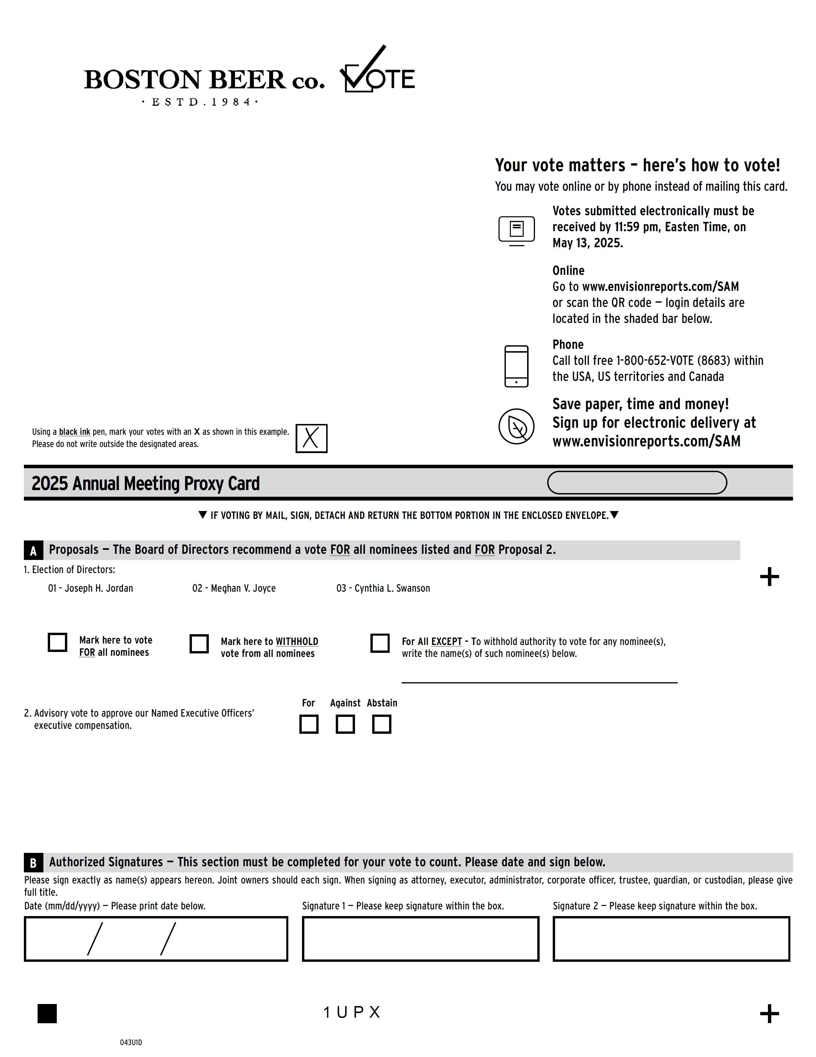 01 - Joseph H. Jordan 02 - Meghan V. Joyce 03 - Cynthia L. Swanson Mark here to vote FOR all nominees 1 U P X For All EXCEPT - To withhold authority to vote for any nominee(s), write the name(s) of such nominee(s) below. Mark here to WITHHOLD vote from all nominees Proposals — The Board of Directors recommend a vote A FOR all nominees listed and FOR Proposal 2. 043U1D 2. Advisory vote to approve our Named Executive Officers’ executive compensation. 1. Election of Directors: For Against Abstain Please sign exactly as name(s) appears hereon. Joint owners should each sign. When signing as attorney, executor, administrator, corporate officer, trustee, guardian, or custodian, please give full title. Date (mm/dd/yyyy) — Please print date below. Signature 1 — Please keep signature within the box. Signature 2 — Please keep signature within the box. B Authorized Signatures — This section must be completed for your vote to count. Please date and sign below. 2025 Annual Meeting Proxy Card Using a black ink pen, mark your votes with an X as shown in this example. Please do not write outside the designated areas. q IF VOTING BY MAIL, SIGN, DETACH AND RETURN THE BOTTOM PORTION IN THE ENCLOSED ENVELOPE.q You may vote online or by phone instead of mailing this card. Online Go to www.envisionreports.com/SAM or scan the QR code — login details are located in the shaded bar below. Your vote matters – here’s how to vote! Votes submitted electronically must be received by 11:59 pm, Easten Time, on May 13, 2025. Save paper, time and money! Sign up for electronic delivery at www.envisionreports.com/SAM Phone Call toll free 1-800-652-VOTE (8683) within the USA, US territories and Canada Small steps make an impact. Help the environment by consenting to receive electronic delivery, sign up at www.envisionreports.com/SAM
