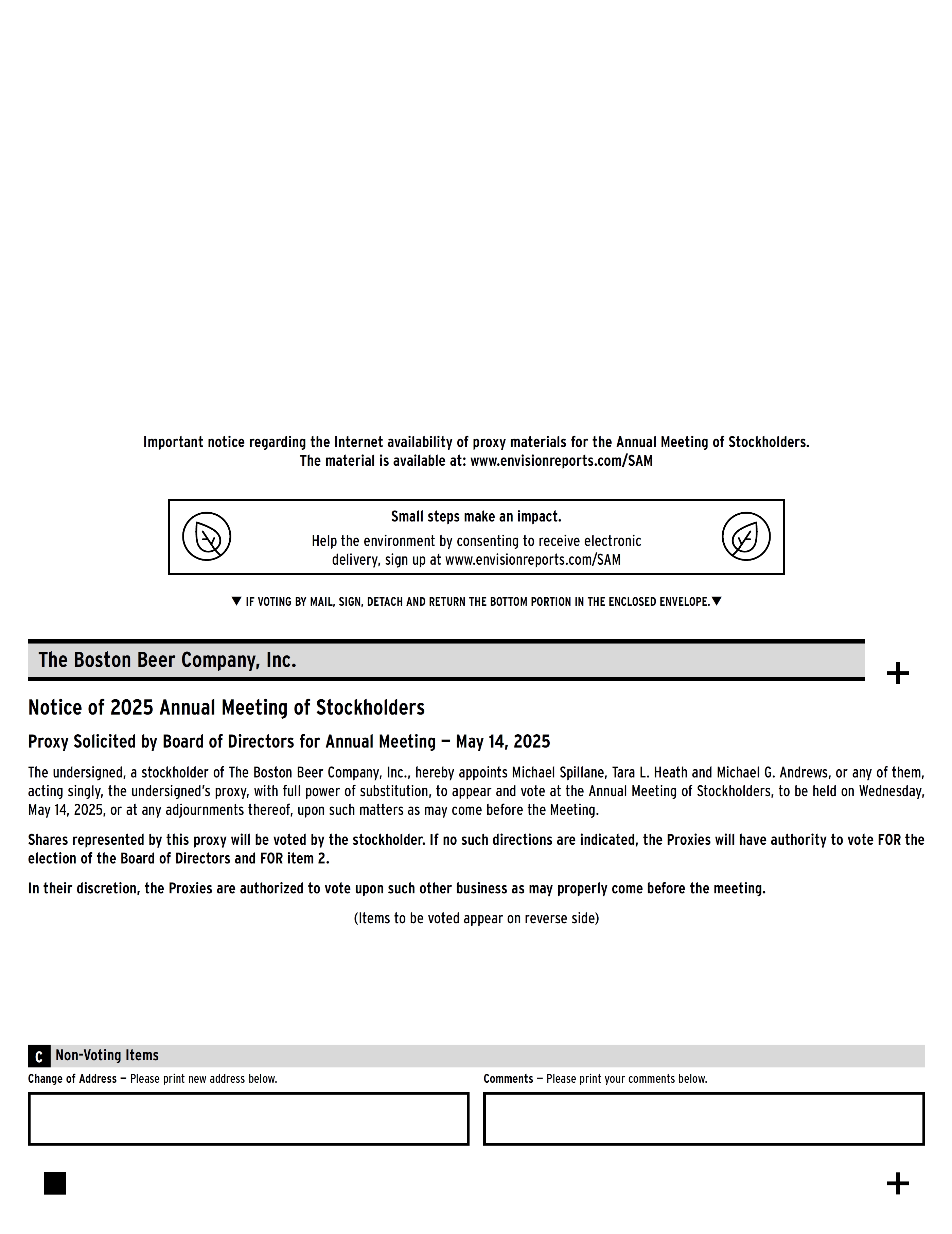 Notice of 2025 Annual Meeting of Stockholders Proxy Solicited by Board of Directors for Annual Meeting — May 14, 2025 The undersigned, a stockholder of The Boston Beer Company, Inc., hereby appoints Michael Spillane, Tara L. Heath and Michael G. Andrews, or any of them, acting singly, the undersigned’s proxy, with full power of substitution, to appear and vote at the Annual Meeting of Stockholders, to be held on Wednesday, May 14, 2025, or at any adjournments thereof, upon such matters as may come before the Meeting. Shares represented by this proxy will be voted by the stockholder. If no such directions are indicated, the Proxies will have authority to vote FOR the election of the Board of Directors and FOR item 2. In their discretion, the Proxies are authorized to vote upon such other business as may properly come before the meeting. (Items to be voted appear on reverse side) The Boston Beer Company, Inc. C Non-Voting Items q IF VOTING BY MAIL, SIGN, DETACH AND RETURN THE BOTTOM PORTION IN THE ENCLOSED ENVELOPE.q Change of Address — Please print new address below. Comments — Please print your comments below. Important notice regarding the Internet availability of proxy materials for the Annual Meeting of Stockholders. The material is available at: www.envisionreports.com/SAM
