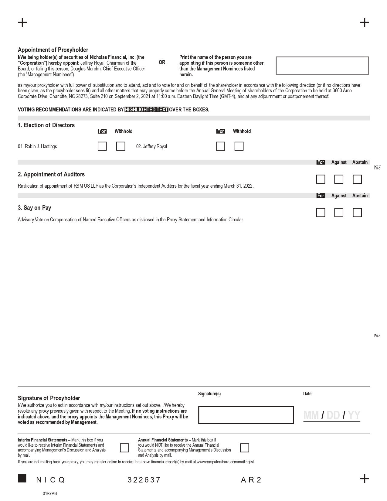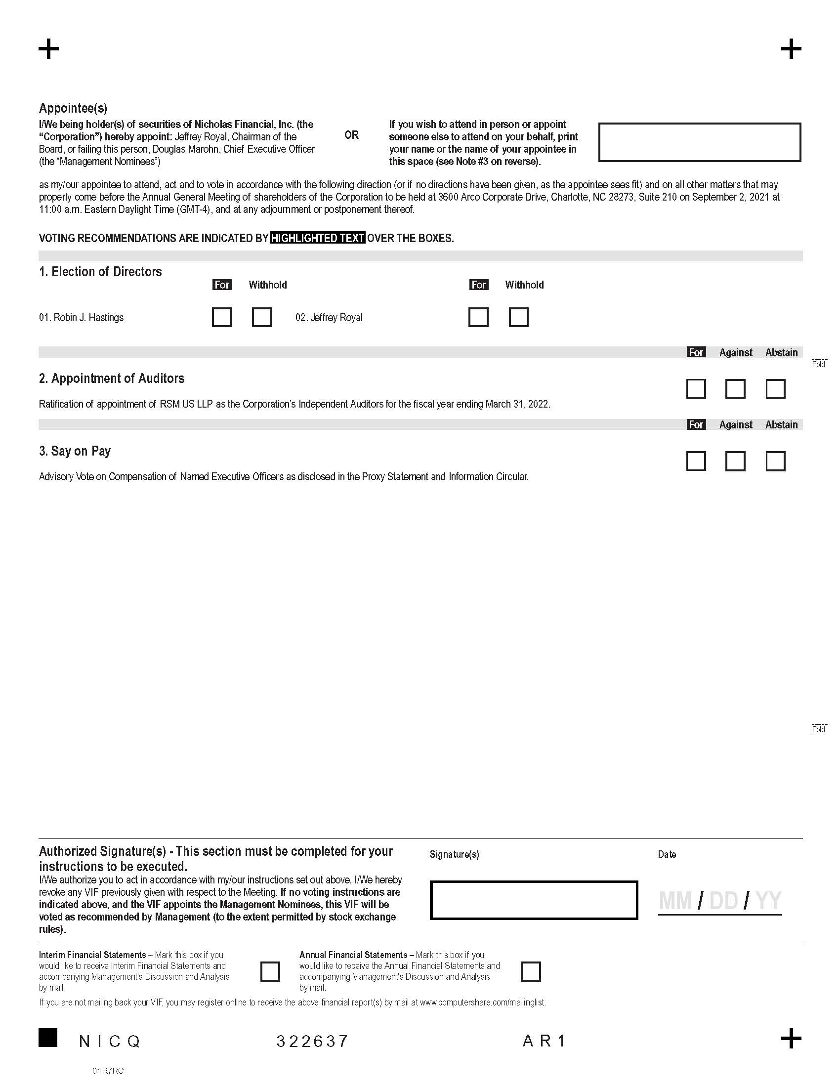 NOTICE IS HEREBY GIVEN that the 2021 Annual General Meeting of Shareholders (the “Meeting”) of Nicholas Financial, Inc. (hereinafter called the “Company”) will be held at the Company’s office, located at 3600 ARCO CORPORATE DRIVE CHARLOTTE, NC 28273, SUITE 210, on Thursday, September 2, 2021, at 11:00 a.m. EDT for the following purposes: