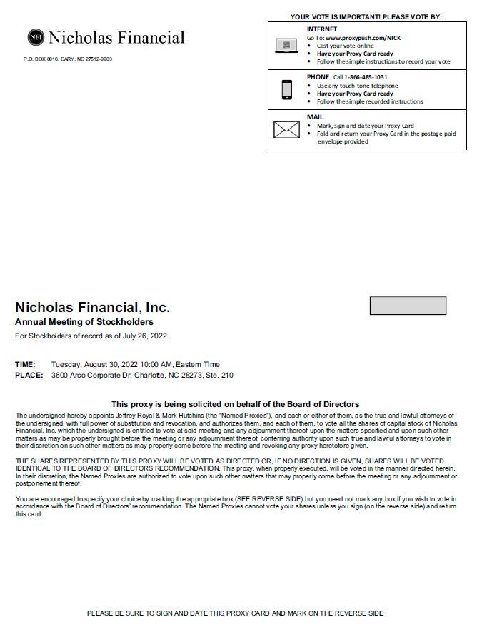 NOTICE IS HEREBY GIVEN that the 2022 Annual General Meeting of Shareholders (the “Meeting”) of Nicholas Financial, Inc. (hereinafter called the “Company”) will be held at the Company’s office, located at 3600 ARCO CORPORATE DRIVE CHARLOTTE, NC 28273, SUITE 210, on Tuesday, August 30, 2022, at 10:00 a.m. Eastern Time for the following purposes: