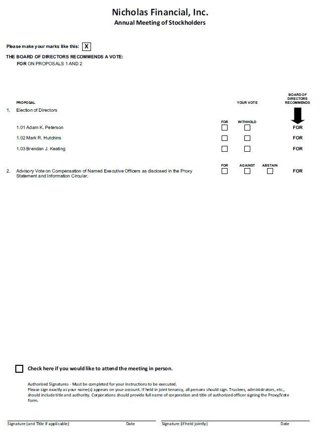The Company’s Annual Report on Form 10-K for the fiscal year ended March 31, 2022 (the “Annual Report”), together with this Proxy Statement and Information Circular and the accompanying form of proxy card or voting instruction form (“Proxy”), are first being mailed on or about August 3, 2022 to shareholders entitled to vote at the Meeting. Additional copies will be provided without charge upon written request to Nicholas Financial, Inc., 2454 McMullen Booth Road, Building C, Clearwater, Florida 33759-1340, Attention: Corporate Secretary. Exhibits filed with our Annual Report on Form 10-K will be provided upon written request, in the same manner as noted above.