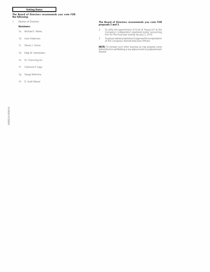 Voting Items 3. To pass an advisory resolution to approve the compensation of the Company's Named Executive Officers. 2. To ratify the appointment of Ernst & Young LLP as the Company's independent registered public accounting firm for the fiscal year ending January 3, 2016. NOTE: To transact such other business as may properly come before the Annual Meeting or any adjournment or postponement thereof. 1a. Michael E. Marks 1b. Irwin Federman 1c. Steven J. Gomo 1d. Eddy W. Hartenstein 1e. Dr. Chenming Hu 1f. Catherine P. Lego 1g. Sanjay Mehrotra 1h. D. Scott Mercer 1. Election of Directors The Board of Directors recommends you vote FOR the following: The Board of Directors recommends you vote FOR proposals 2 and 3. Nominees: M89324-P64918 |