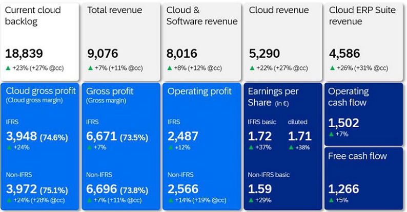 In the third quarter, current cloud backlog grew by 23% to €18.84 billion and was up 27% at constant currencies, retaining its second quarter growth momentum considering that the WalkMe acquisition is now in the base. Cloud revenue was up 22% to €5.29 billion and up 27% at constant currencies. Cloud ERP Suite revenue was up 26% to €4.59 billion and up 31% at constant currencies.