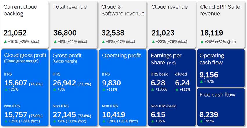 Cloud revenue was up 19% to €5.61 billion and up 26% at constant currencies. Cloud ERP Suite revenue was up 23% to €4.86 billion and up 30% at constant currencies.