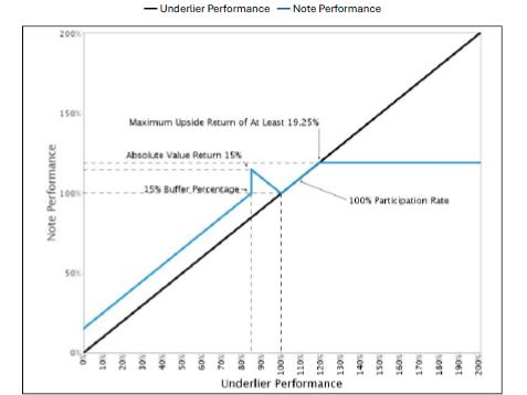 Investors will receive on the Maturity Date per $1,000 principal amount of Notes: · If the Final Underlier Value is greater than the Initial Underlier Value, an amount equal to: $1,000 + ($1,000 × the lesser of (a) Underlier Return × Participation Rate and (b) Maximum Upside Return) · If the Final Underlier Value is less than or equal to the Initial Underlier Value, but is greater than or equal to the Buffer Value, an amount equal to: $1,000 + (-1 × $1,000 × Underlier Return) In this case, you will receive a positive return on the Notes equal to the absolute value of the Underlier Return, even though the Underlier Return is negative. In no event will this return exceed 15%. · If the Final Underlier Value is less than the Buffer Value, an amount equal to: