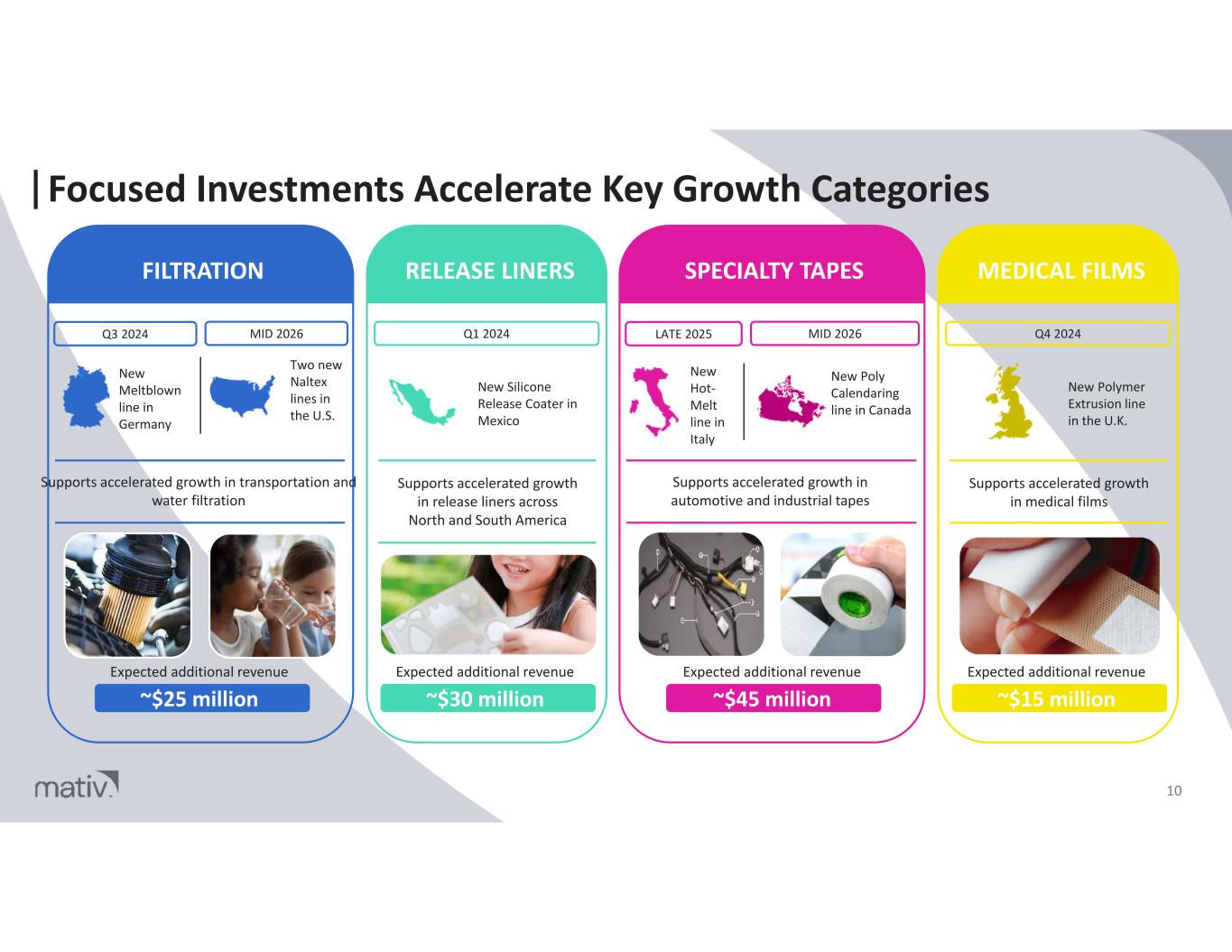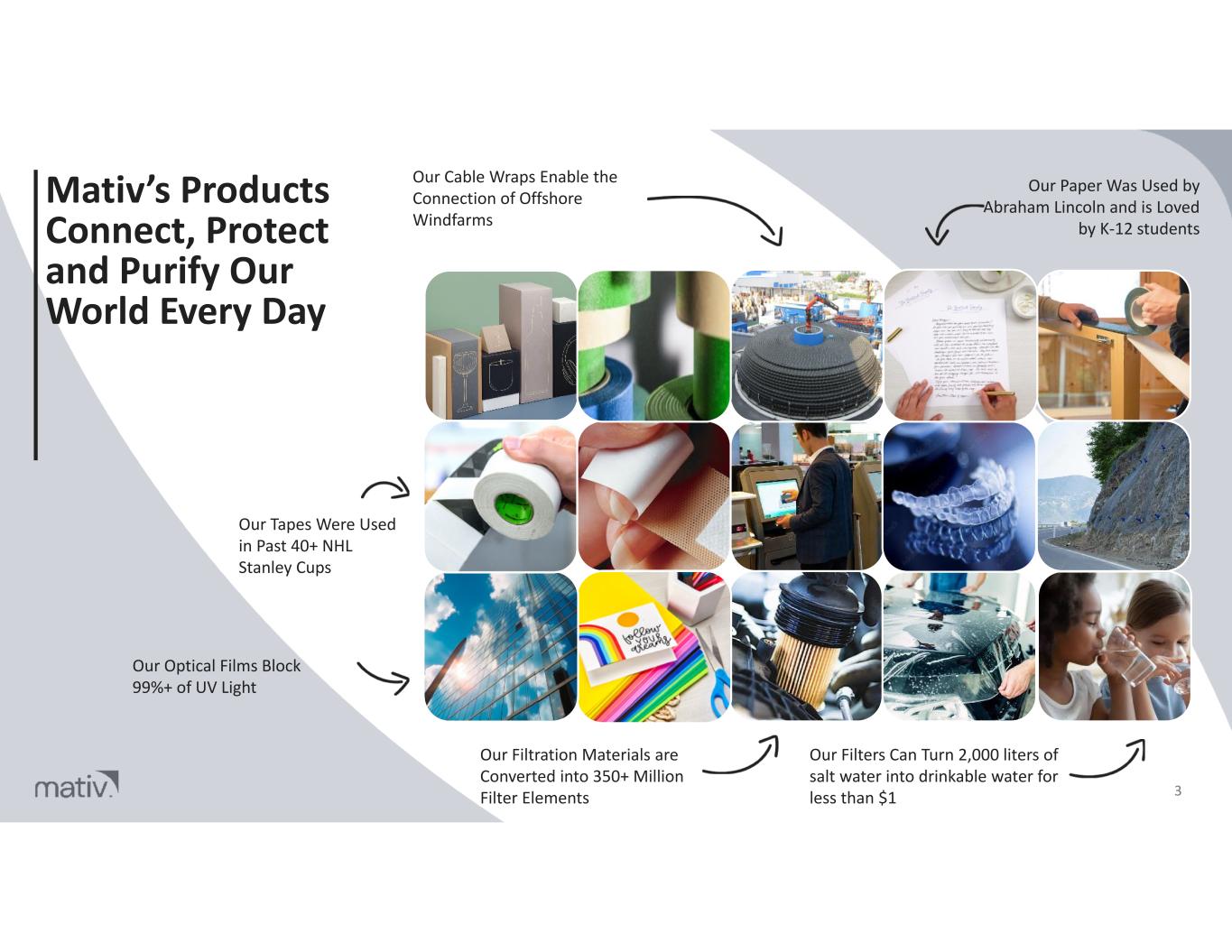Mativ’s Products Connect, Protect and Purify Our World Every Day Our Cable Wraps Enable the Connection of Offshore Windfarms Our Paper Was Used by Abraham Lincoln and is Loved by K-12 students Our Tapes Were Used in Past 40+ NHL Stanley Cups Our Optical Films Block 99%+ of UV Light Our Filtration Materials are Converted into 350+ Million Filter Elements 3 Our Filters Can Turn 2,000 liters of salt water into drinkable water for less than $1