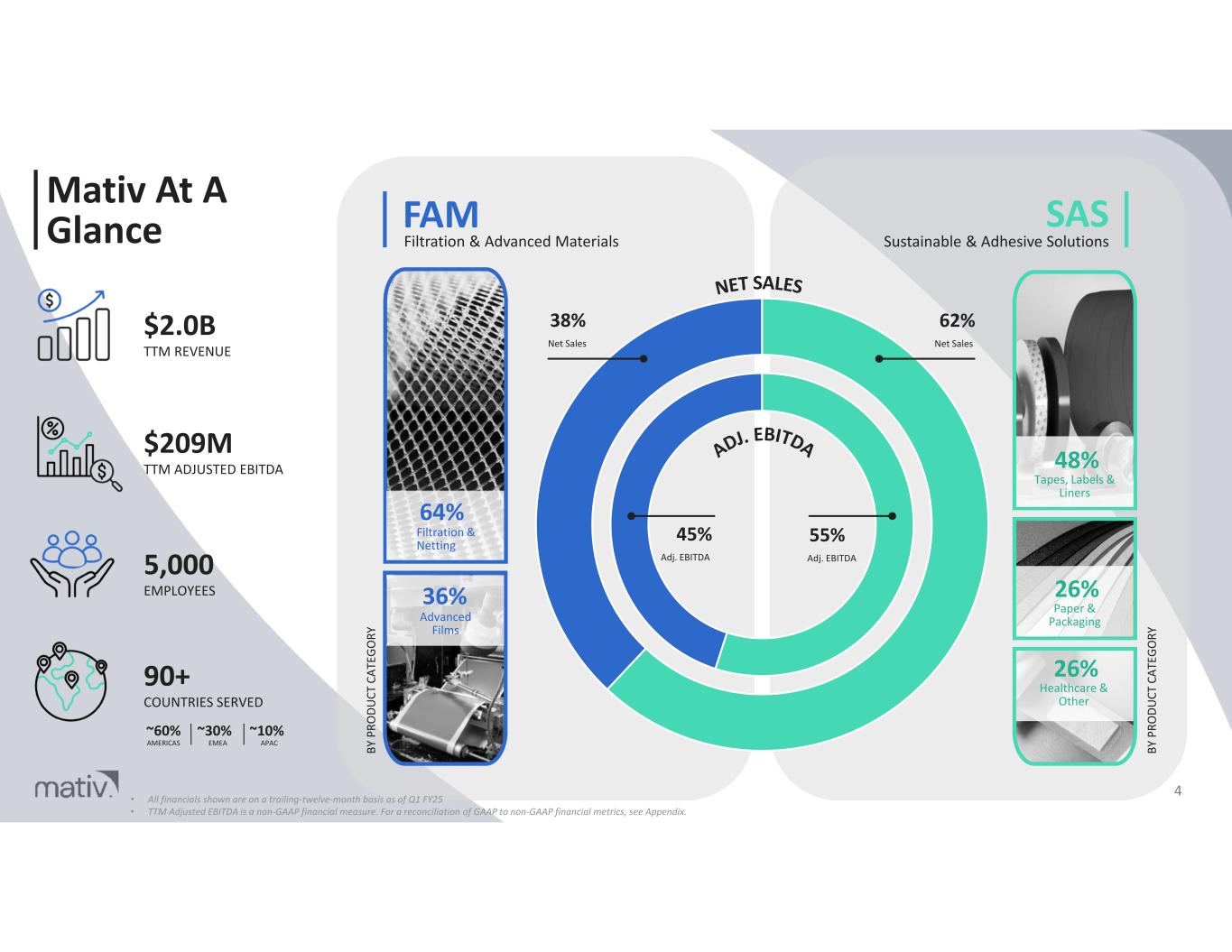 Mativ At A Glance $2.0B TTM REVENUE $209M TTM ADJUSTED EBITDA 5,000 EMPLOYEES 90+ COUNTRIES SERVED ~60% AMERICAS ~30% EMEA ~10% APAC FAM Filtration & Advanced Materials SAS Sustainable & Adhesive Solutions 4 64% Filtration & Netting 36% Advanced Films 48% Tapes, Labels & Liners 26% Paper & Packaging 26% Healthcare & Other BY P RO DU CT C AT EG OR Y BY P RO DU CT C AT EG OR Y 38% Net Sales 62% Net Sales 45% Adj. EBITDA 55% Adj. EBITDA • All financials shown are on a trailing-twelve-month basis as of Q1 FY25 • TTM Adjusted EBITDA is a non-GAAP financial measure. For a reconciliation of GAAP to non-GAAP financial metrics, see Appendix.