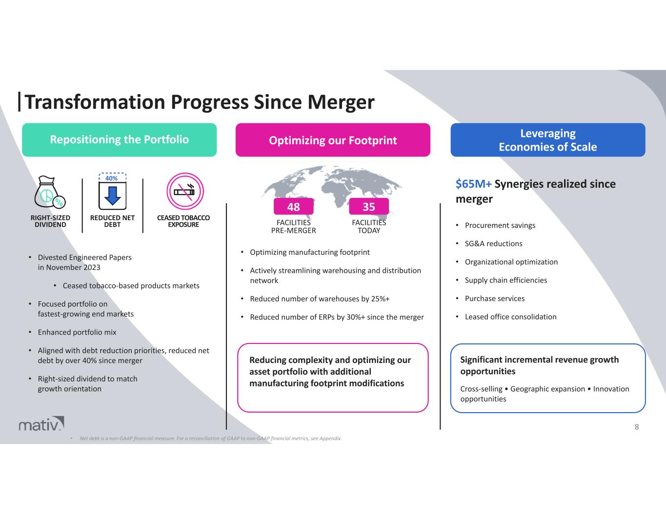 Transformation Progress Since Merger 8 Leveraging Economies of Scale $65M+ Synergies realized since merger • Procurement savings • SG&A reductions • Organizational optimization • Supply chain efficiencies • Purchase services • Leased office consolidation Significant incremental revenue growth opportunities Cross-selling • Geographic expansion • Innovation opportunities Optimizing our Footprint FACILITIES PRE-MERGER 48 FACILITIES TODAY 35 • Optimizing manufacturing footprint • Actively streamlining warehousing and distribution network • Reduced number of warehouses by 25%+ • Reduced number of ERPs by 30%+ since the merger Reducing complexity and optimizing our asset portfolio with additional manufacturing footprint modifications Repositioning the Portfolio RIGHT-SIZED DIVIDEND REDUCED NET DEBT CEASED TOBACCO EXPOSURE • Divested Engineered Papers in November 2023 • Ceased tobacco-based products markets • Focused portfolio on fastest-growing end markets • Enhanced portfolio mix • Aligned with debt reduction priorities, reduced net debt by over 40% since merger • Right-sized dividend to match growth orientation • Net debt is a non-GAAP financial measure. For a reconciliation of GAAP to non-GAAP financial metrics, see Appendix. 40%
