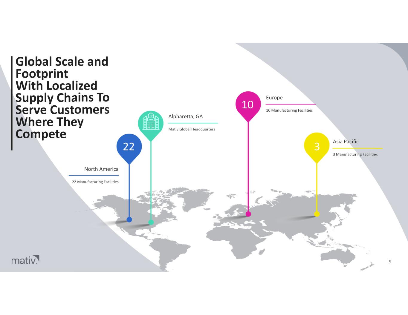 Global Scale and Footprint With Localized Supply Chains To Serve Customers Where They Compete 9 Asia Pacific 3 Manufacturing Facilities North America 22 Manufacturing Facilities Alpharetta, GA Mativ Global Headquarters Europe 10 Manufacturing Facilities 10 322