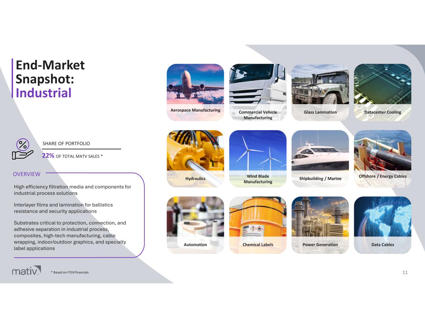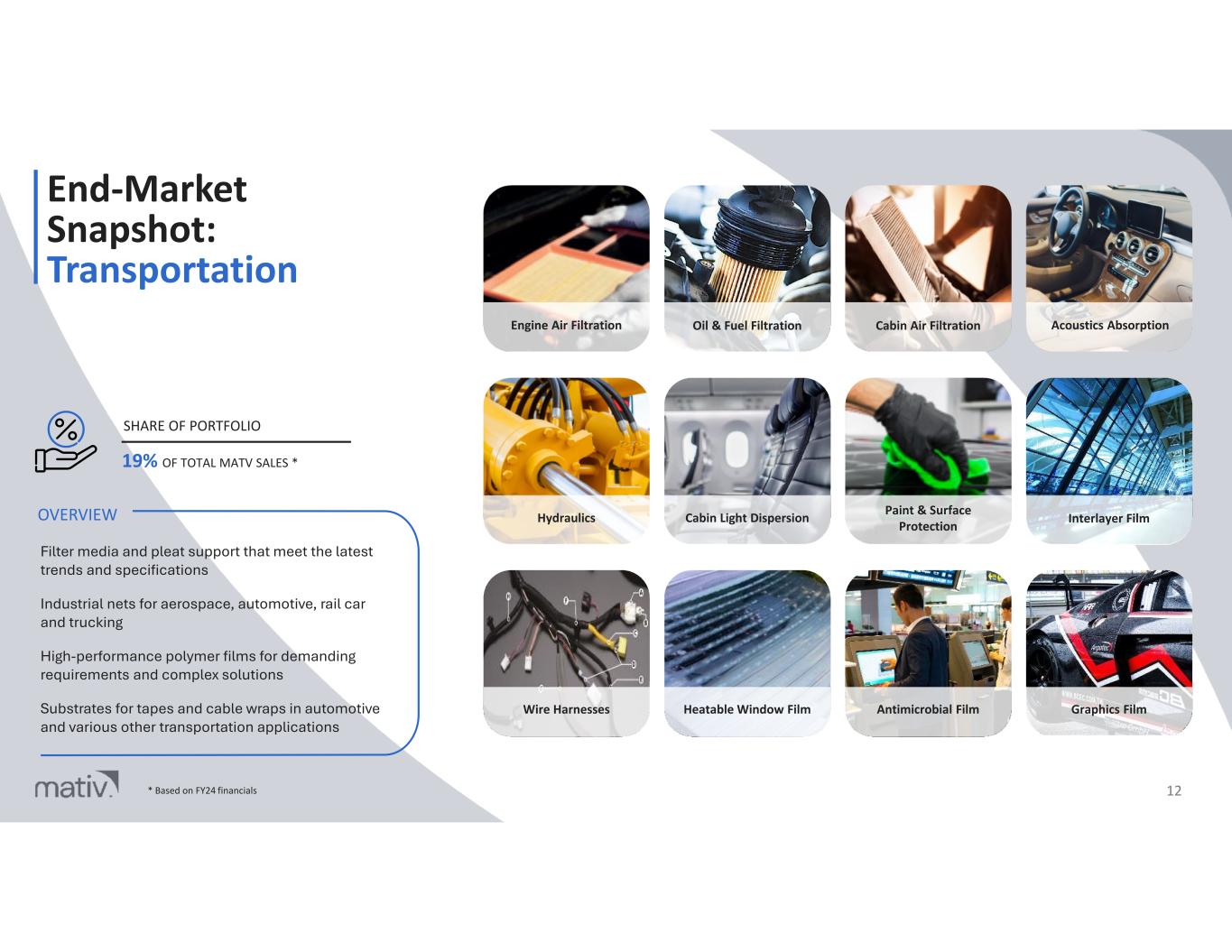 End-Market Snapshot: Industrial 11 High efficiency filtration media and components for industrial process solutions Interlayer films and lamination for ballistics resistance and security applications Substrates critical to protection, connection, and adhesive separation in industrial process, composites, high-tech manufacturing, cable wrapping, indoor/outdoor graphics, and specialty label applications OVERVIEW 22% OF TOTAL MATV SALES * SHARE OF PORTFOLIO Aerospace Manufacturing Commercial Vehicle Manufacturing Glass Lamination Datacenter Cooling Hydraulics Wind Blade Manufacturing Shipbuilding / Marine Offshore / Energy Cables Automation Chemical Labels Power Generation Data Cables * Based on FY24 financials