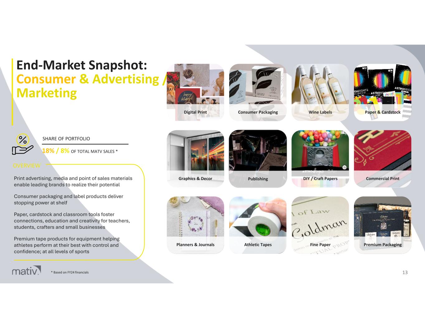 End-Market Snapshot: Transportation 12 Engine Air Filtration Oil & Fuel Filtration Cabin Air Filtration Acoustics Absorption Hydraulics Cabin Light Dispersion Paint & Surface Protection Interlayer Film Wire Harnesses Heatable Window Film Antimicrobial Film Graphics Film 19% OF TOTAL MATV SALES * SHARE OF PORTFOLIO Filter media and pleat support that meet the latest trends and specifications Industrial nets for aerospace, automotive, rail car and trucking High-performance polymer films for demanding requirements and complex solutions Substrates for tapes and cable wraps in automotive and various other transportation applications OVERVIEW * Based on FY24 financials
