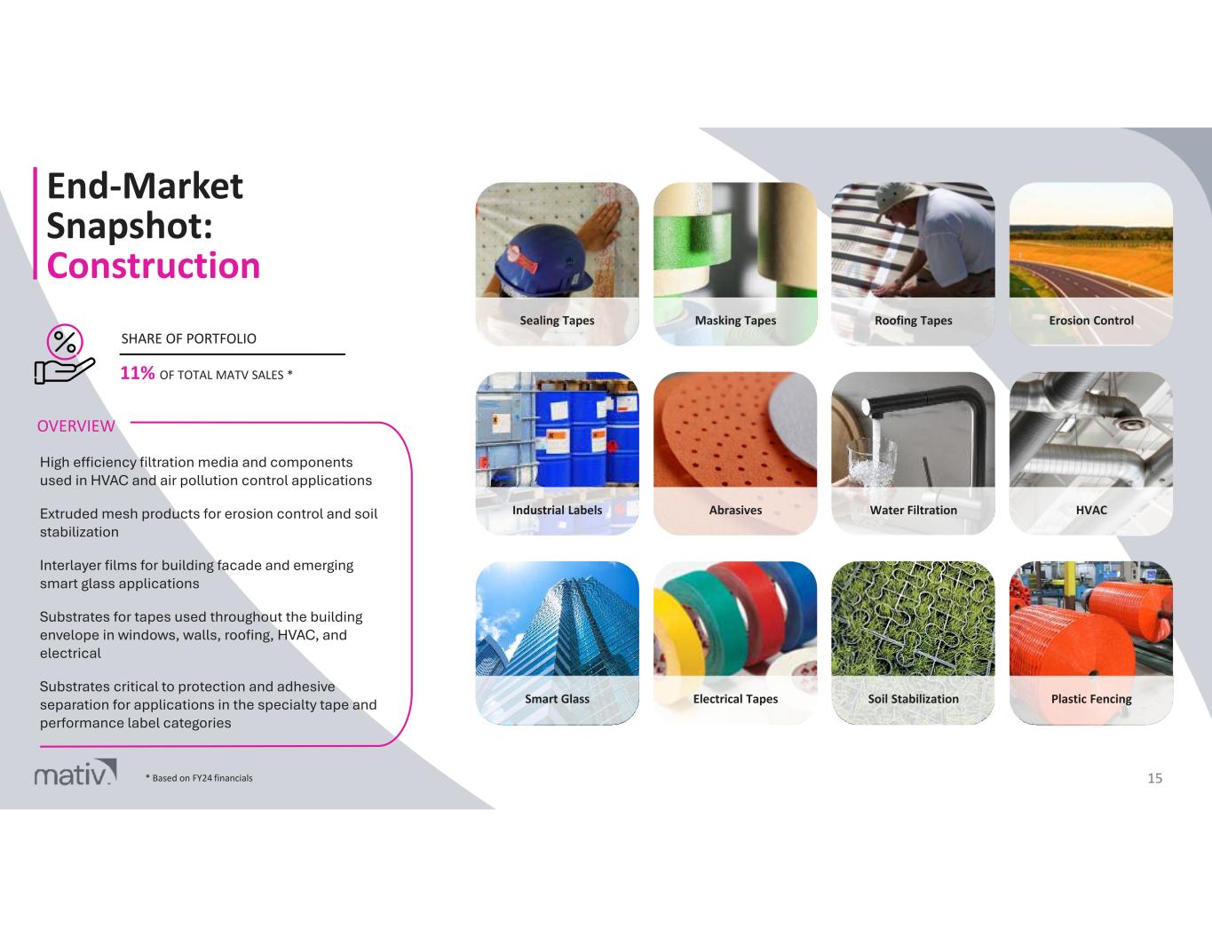 End-Market Snapshot: Healthcare Our healthcare portfolio includes solutions for advanced wound care, consumer wellness, device fixation, medical packaging, and a wide range of other applications Substrates critical to protection and adhesive separation for applications in the medical and personal care categories High-performance medical films and composites for consumer products and advanced wound care OVERVIEW 14% OF TOTAL MATV SALES * SHARE OF PORTFOLIO Personal Care 14 Ostomy Care Advanced Wound Care Personal Hygiene Cont. Monitoring Skin Care Dental Films Device Fixation Wound Care HME Filtration Medical Hygiene Medical Packaging * Based on FY24 financials
