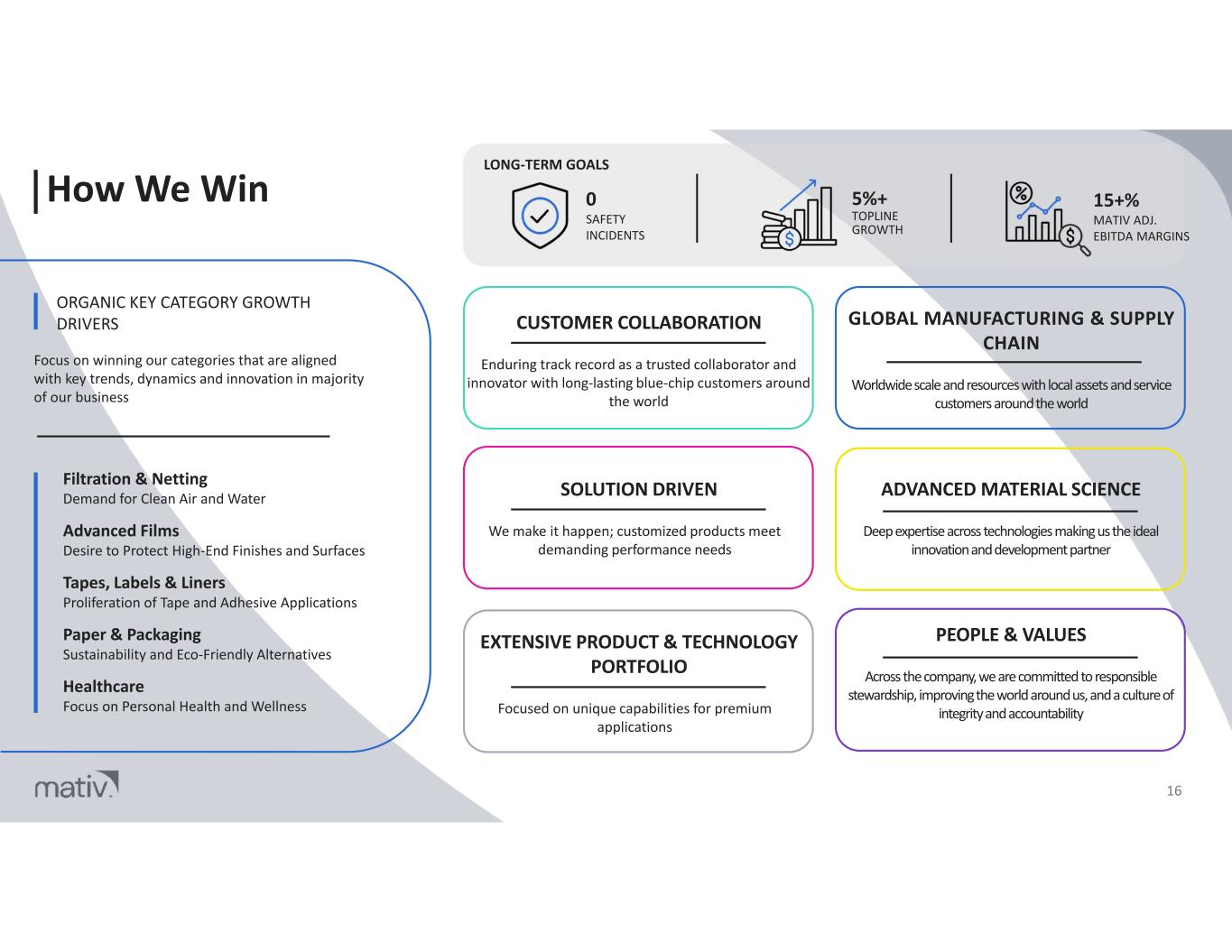 End-Market Snapshot: Construction 15 11% OF TOTAL MATV SALES * SHARE OF PORTFOLIO High efficiency filtration media and components used in HVAC and air pollution control applications Extruded mesh products for erosion control and soil stabilization Interlayer films for building facade and emerging smart glass applications Substrates for tapes used throughout the building envelope in windows, walls, roofing, HVAC, and electrical Substrates critical to protection and adhesive separation for applications in the specialty tape and performance label categories OVERVIEW Sealing Tapes Masking Tapes Roofing Tapes Erosion Control Industrial Labels Abrasives Water Filtration HVAC Smart Glass Electrical Tapes Soil Stabilization Plastic Fencing * Based on FY24 financials