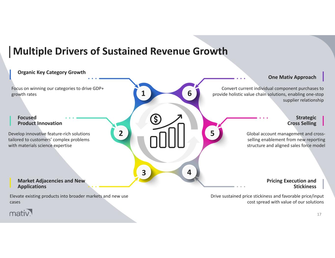 How We Win 16 0 SAFETY INCIDENTS 15+% MATIV ADJ. EBITDA MARGINS 5%+ TOPLINE GROWTH Focus on winning our categories that are aligned with key trends, dynamics and innovation in majority of our business Filtration & Netting Demand for Clean Air and Water Advanced Films Desire to Protect High-End Finishes and Surfaces Tapes, Labels & Liners Proliferation of Tape and Adhesive Applications Paper & Packaging Sustainability and Eco-Friendly Alternatives Healthcare Focus on Personal Health and Wellness CUSTOMER COLLABORATION Enduring track record as a trusted collaborator and innovator with long-lasting blue-chip customers around the world SOLUTION DRIVEN We make it happen; customized products meet demanding performance needs EXTENSIVE PRODUCT & TECHNOLOGY PORTFOLIO Focused on unique capabilities for premium applications GLOBAL MANUFACTURING & SUPPLY CHAIN Worldwide scale and resources with local assets and service customers around the world ADVANCED MATERIAL SCIENCE Deep expertise across technologies making us the ideal innovation and development partner PEOPLE & VALUES Across the company, we are committed to responsible stewardship, improving the world around us, and a culture of integrity and accountability ORGANIC KEY CATEGORY GROWTH DRIVERS LONG-TERM GOALS