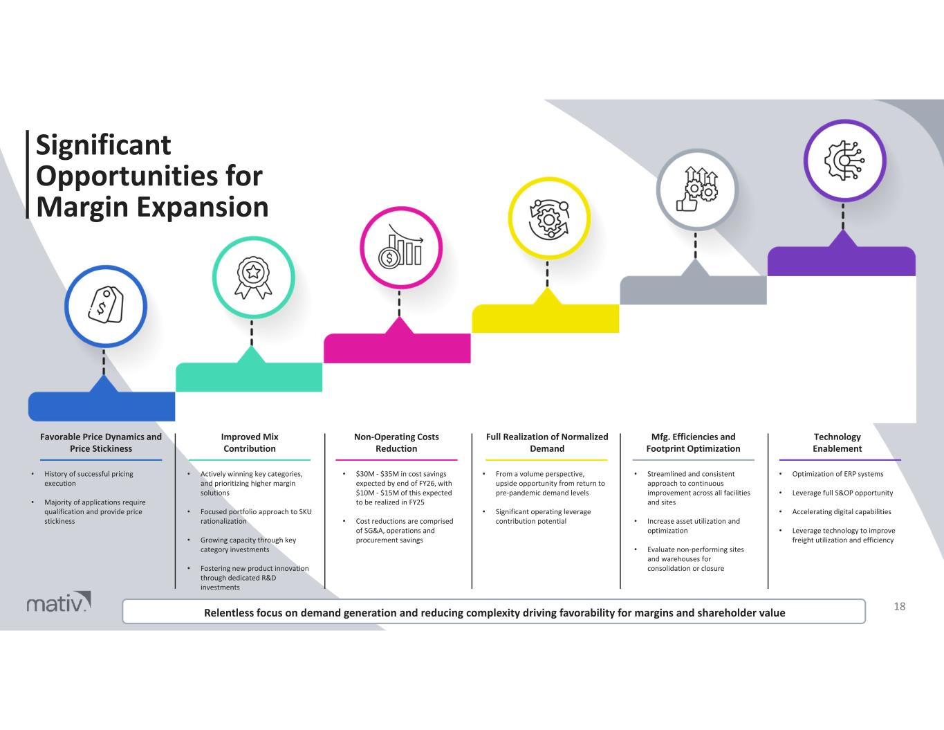 Multiple Drivers of Sustained Revenue Growth 17 Organic Key Category Growth Focus on winning our categories to drive GDP+ growth rates Focused Product Innovation Develop innovative feature-rich solutions tailored to customers’ complex problems with materials science expertise Market Adjacencies and New Applications Elevate existing products into broader markets and new use cases One Mativ Approach Convert current individual component purchases to provide holistic value chain solutions, enabling one-stop supplier relationship Strategic Cross Selling Global account management and cross- selling enablement from new reporting structure and aligned sales force model Pricing Execution and Stickiness Drive sustained price stickiness and favorable price/input cost spread with value of our solutions 1 6 2 3 4 5