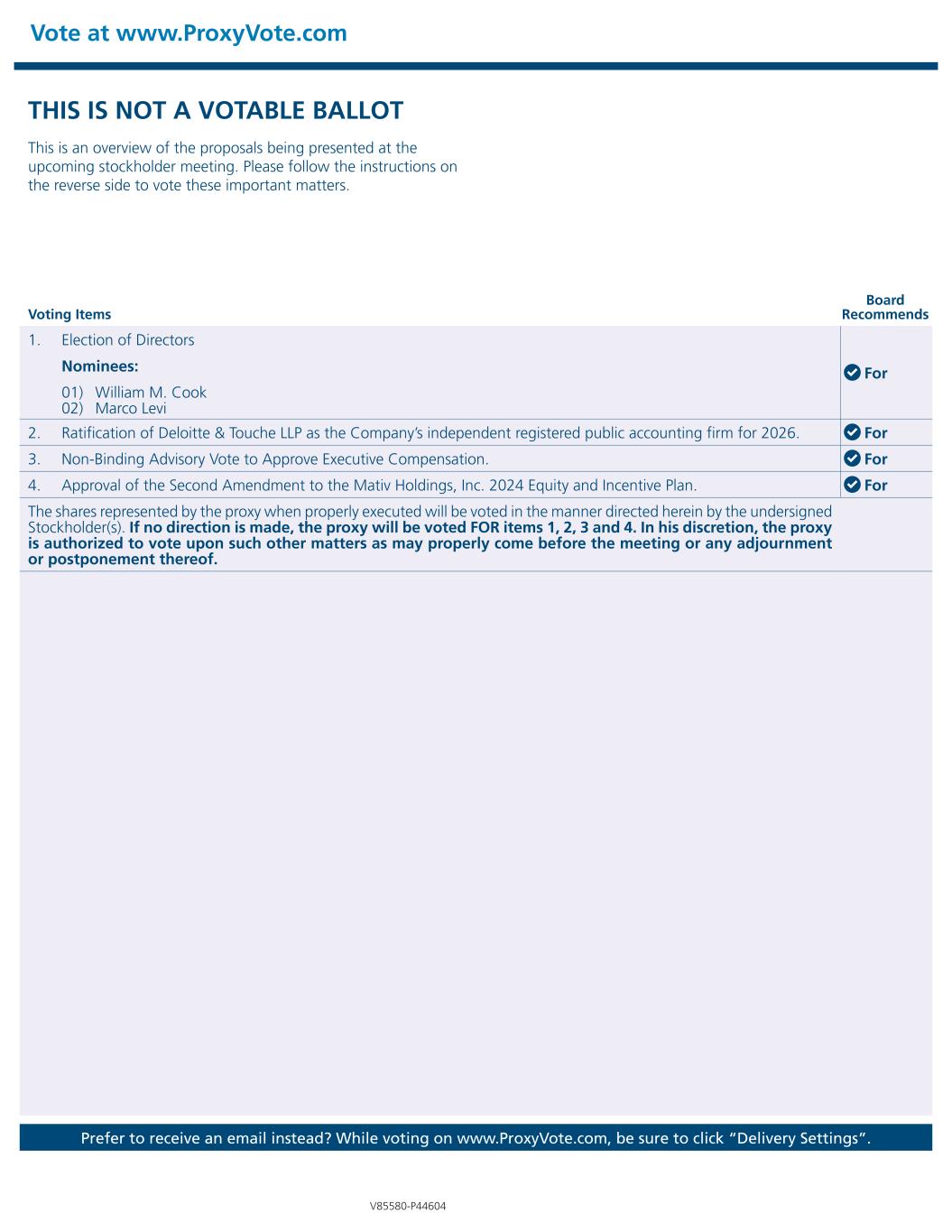 Vote at www.ProxyVote.com Prefer to receive an email instead? While voting on www.ProxyVote.com, be sure to click “Delivery Settings”. Voting Items Board Recommends V85580-P44604 THIS IS NOT A VOTABLE BALLOT This is an overview of the proposals being presented at the upcoming stockholder meeting. Please follow the instructions on the reverse side to vote these important matters. 1. Election of Directors For Nominees: 01) William M. Cook 02) Marco Levi 2. Ratification of Deloitte & Touche LLP as the Company’s independent registered public accounting firm for 2026. For 3. Non-Binding Advisory Vote to Approve Executive Compensation. For 4. Approval of the Second Amendment to the Mativ Holdings, Inc. 2024 Equity and Incentive Plan. For The shares represented by the proxy when properly executed will be voted in the manner directed herein by the undersigned Stockholder(s). If no direction is made, the proxy will be voted FOR items 1, 2, 3 and 4. In his discretion, the proxy is authorized to vote upon such other matters as may properly come before the meeting or any adjournment or postponement thereof.