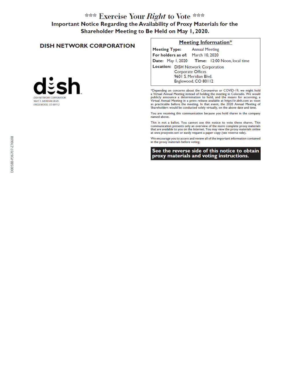 *** Exercise Your Right to Vote *** Important Notice Regarding the Availability of Proxy Materials for the Shareholder Meeting to Be Held on May 1, 2020. DISH NETWORK CORPORATION *Depending on concerns about the Coronavirus or COVID-19, we might hold a Virtual Annual Meeting instead of holding the meeting in Colorado. We would publicly announce a determination to hold, and the means for accessing, a Virtual Annual Meeting in a press release available at https://ir.dish.com as soon as practicable before the meeting. In that event, the 2020 Annual Meeting of Shareholders would be conducted solely virtually, on the above date and time. You are receiving this communication because you hold shares in the company named above. This is not a ballot. You cannot use this notice to vote these shares. This communication presents only an overview of the more complete proxy materials that are available to you on the Internet. You may view the proxy materials online at www.proxyvote.com or easily request a paper copy (see reverse side). We encourage you to access and review all of the important information contained in the proxy materials before voting. DISH NETWORK CORPORATION 9601 S. MERIDIAN BLVD. ENGLEWOOD, CO 80112 proxy materials and voting instructions. D00588-P36707-Z76608 See the reverse side of this notice to obtain Meeting Information* Meeting Type:Annual Meeting For holders as of:March 10, 2020 Date: May 1, 2020Time: 12:00 Noon, local time Location: DISH Network Corporation Corporate Offices 9601 S. Meridian Blvd. Englewood, CO 80112