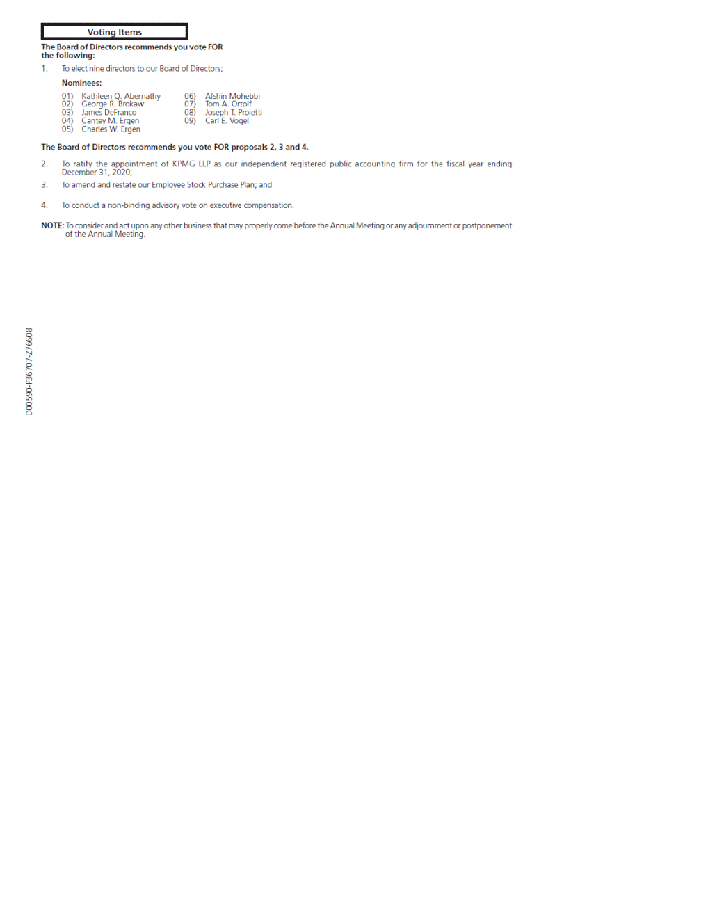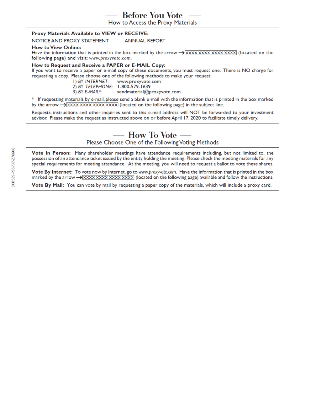 Before You Vote How to Access the Proxy Materials How To Vote Please Choose One of the Following Voting Methods D00589-P36707-Z76608 Vote In Person: Many shareholder meetings have attendance requirements including, but not limited to, the possession of an attendance ticket issued by the entity holding the meeting. Please check the meeting materials for any special requirements for meeting attendance. At the meeting, you will need to request a ballot to vote these shares. Vote By Internet: To vote now by Internet, go to www.proxyvote.com. Have the information that is printed in the box marked by the arrow (located on the following page) available and follow the instructions. Vote By Mail: You can vote by mail by requesting a paper copy of the materials, which will include a proxy card. XXXX XXXX XXXX XXXX Proxy Materials Available to VIEW or RECEIVE: NOTICE AND PROXY STATEMENTANNUAL REPORT How to View Online: Have the information that is printed in the box marked by the arrow(located on the following page) and visit: www.proxyvote .com. How to Request and Receive a PAPER or E-MAIL Copy: If you want to receive a paper or e-mail copy of these documents, you must request one. There is NO charge for requesting a copy. Please choose one of the following methods to make your request: 1) BY INTERNET:www.proxyvote.com 2) BY TELEPHONE: 1-800-579-1639 3) BY E-MAIL*:sendmaterial@proxyvote.com * If requesting materials by e-mail, please send a blank e-mail with the information that is printed in the box marked by the arrow(located on the following page) in the subject line. Requests, instructions and other inquiries sent to this e-mail address will NOT be forwarded to your investment advisor. Please make the request as instructed above on or before April 17, 2020 to facilitate timely delivery. XXXX XXXX XXXX XXXX XXXX XXXX XXXX XXXX