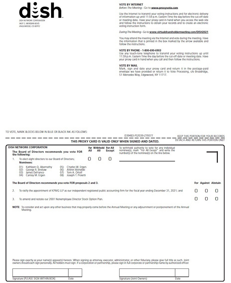 Meeting Information2021 Annual Meeting of ShareholdersApril 30, 2021 at 12:00 Noon, Mountain Time atwww.virtualshareholdermeeting.com/DISH2021Important Notice Regarding the Availability of Proxy Materials for the Annual Meeting:The Notice and Proxy Statement and Annual Report are available at www.proxyvote.com.D39484-P52039-Z79377DISH NETWORK CORPORATIONPROXY SOLICITED ON BEHALF OF THE BOARD OF DIRECTORSThe undersigned hereby appoints Charles W. Ergen and Timothy A. Messner, each with the power to appoint his substitute, and hereby authorizes them to represent and to vote as designated below, all Class A Shares and Class B Shares of DISH Network Corporation held of record by the undersigned on March 9, 2021, at the Annual Meeting of Shareholders to be held on April 30, 2021, or any adjournment or postponement thereof.THIS PROXY WHEN PROPERLY EXECUTED WILL BE VOTED IN THE MANNER DIRECTED HEREIN BY THE UNDERSIGNED SHAREHOLDER. IF NO DIRECTION IS MADE THIS PROXY WILL BE VOTED (1) FOR THE ELECTION OF EACH OF THE EIGHT DIRECTORS SET FORTH ABOVE, (2) FOR THE RATIFICATION OF THE APPOINTMENT OF KPMG LLP AS OUR INDEPENDENT REGISTERED PUBLIC ACCOUNTING FIRM FOR FISCAL YEAR ENDING DECEMBER 31, 2021, AND (3) TO AMEND AND RESTATE OUR 2001 NONEMPLOYEE DIRECTOR STOCK OPTION PLAN. THIS PROXY CONFERS DISCRETIONARY AUTHORITY WITH RESPECT TO PROPOSALS NOT KNOWN OR DETERMINED AT THE TIME OF THE MAILING OF THE NOTICE OF ANNUAL MEETING OF SHAREHOLDERS TO THE UNDERSIGNED.PLEASE SIGN AND RETURN THIS PROXY IN THE ENCLOSED PRE-ADDRESSED ENVELOPE. THE TENDER OF A PROXY WILL NOT AFFECT YOUR RIGHT TO VOTE IN PERSON IF YOU ATTEND THE MEETING OR TO SUBMIT A LATER DATED REVOCATION OR AMENDMENT TO THIS PROXY ON ANY OF THE ISSUES SET FORTH ON THE REVERSE SIDE.Continued and