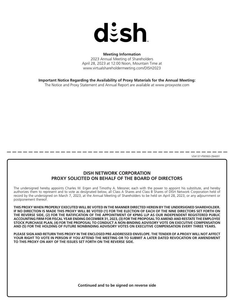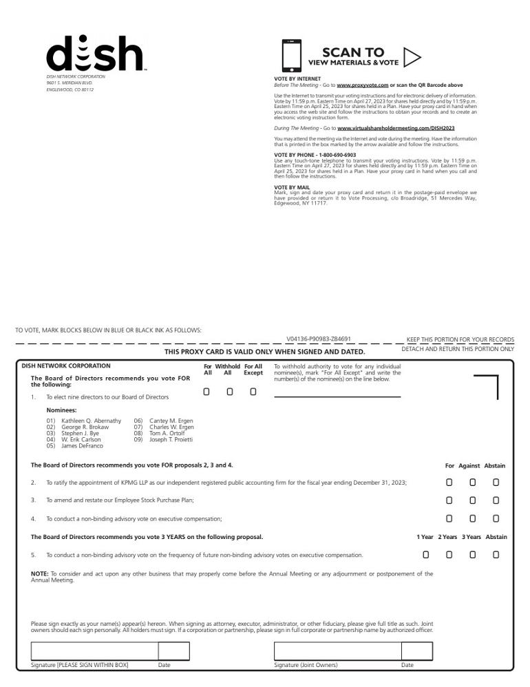 V04137-P90983-Z84691 DISH NETWORK CORPORATION PROXY SOLICITED ON BEHALF OF THE BOARD OF DIRECTORS The undersigned hereby appoints Charles W. Ergen and Timothy A. Messner, each with the power to appoint his substitute, and hereby authorizes them to represent and to vote as designated below, all Class A Shares and Class B Shares of DISH Network Corporation held of record by the undersigned on March 7, 2023, at the Annual Meeting of Shareholders to be held on April 28, 2023, or any adjournment or postponement thereof. THIS PROXY WHEN PROPERLY EXECUTED WILL BE VOTED IN THE MANNER DIRECTED HEREIN BY THE UNDERSIGNED SHAREHOLDER. IF NO DIRECTION IS MADE THIS PROXY WILL BE VOTED (1) FOR THE ELECTION OF EACH OF THE NINE DIRECTORS SET FORTH ON THE REVERSE SIDE, (2) FOR THE RATIFICATION OF THE APPOINTMENT OF KPMG LLP AS OUR INDEPENDENT REGISTERED PUBLIC ACCOUNTING FIRM FOR FISCAL YEAR ENDING DECEMBER 31, 2023, (3) FOR THE PROPOSAL TO AMEND AND RESTATE THE EMPLOYEE STOCK PURCHASE PLAN, (4) FOR THE PROPOSAL TO CONDUCT A NON-BINDING ADVISORY VOTE ON EXECUTIVE COMPENSATION AND (5) FOR THE HOLDING OF FUTURE NONBINDING ADVISORY VOTES ON EXECUTIVE COMPENSATION EVERY THREE YEARS. PLEASE SIGN AND RETURN THIS PROXY IN THE ENCLOSED PRE-ADDRESSED ENVELOPE. THE TENDER OF A PROXY WILL NOT AFFECT YOUR RIGHT TO VOTE IN PERSON IF YOU ATTEND THE MEETING OR TO SUBMIT A LATER DATED REVOCATION OR AMENDMENT TO THIS PROXY ON ANY OF THE ISSUES SET FORTH ON THE REVERSE SIDE. Continued and to be signed on reverse side Important Notice Regarding the Availability of Proxy Materials for the Annual Meeting: The Notice and Proxy Statement and Annual Report are available at www.proxyvote.com Meeting Information 2023 Annual Meeting of Shareholders April 28, 2023 at 12:00 Noon, Mountain Time at www.virtualshareholdermeeting.com/DISH2023