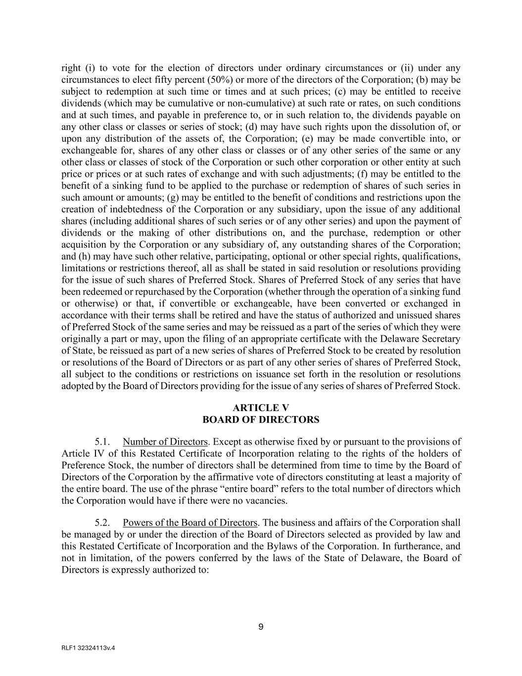 9 RLF1 32324113v.4 right (i) to vote for the election of directors under ordinary circumstances or (ii) under any circumstances to elect fifty percent (50%) or more of the directors of the Corporation; (b) may be subject to redemption at such time or times and at such prices; (c) may be entitled to receive dividends (which may be cumulative or non-cumulative) at such rate or rates, on such conditions and at such times, and payable in preference to, or in such relation to, the dividends payable on any other class or classes or series of stock; (d) may have such rights upon the dissolution of, or upon any distribution of the assets of, the Corporation; (e) may be made convertible into, or exchangeable for, shares of any other class or classes or of any other series of the same or any other class or classes of stock of the Corporation or such other corporation or other entity at such price or prices or at such rates of exchange and with such adjustments; (f) may be entitled to the benefit of a sinking fund to be applied to the purchase or redemption of shares of such series in such amount or amounts; (g) may be entitled to the benefit of conditions and restrictions upon the creation of indebtedness of the Corporation or any subsidiary, upon the issue of any additional shares (including additional shares of such series or of any other series) and upon the payment of dividends or the making of other distributions on, and the purchase, redemption or other acquisition by the Corporation or any subsidiary of, any outstanding shares of the Corporation; and (h) may have such other relative, participating, optional or other special rights, qualifications, limitations or restrictions thereof, all as shall be stated in said resolution or resolutions providing for the issue of such shares of Preferred Stock. Shares of Preferred Stock of any series that have been redeemed or repurchased by the Corporation (whether through the operation of a sinking fund or otherwise) or that, if convertible or exchangeable, have been converted or exchanged in accordance with their terms shall be retired and have the status of authorized and unissued shares of Preferred Stock of the same series and may be reissued as a part of the series of which they were originally a part or may, upon the filing of an appropriate certificate with the Delaware Secretary of State, be reissued as part of a new series of shares of Preferred Stock to be created by resolution or resolutions of the Board of Directors or as part of any other series of shares of Preferred Stock, all subject to the conditions or restrictions on issuance set forth in the resolution or resolutions adopted by the Board of Directors providing for the issue of any series of shares of Preferred Stock. ARTICLE V BOARD OF DIRECTORS 5.1. Number of Directors. Except as otherwise fixed by or pursuant to the provisions of Article IV of this Restated Certificate of Incorporation relating to the rights of the holders of Preference Stock, the number of directors shall be determined from time to time by the Board of Directors of the Corporation by the affirmative vote of directors constituting at least a majority of the entire board. The use of the phrase “entire board” refers to the total number of directors which the Corporation would have if there were no vacancies. 5.2. Powers of the Board of Directors. The business and affairs of the Corporation shall be managed by or under the direction of the Board of Directors selected as provided by law and this Restated Certificate of Incorporation and the Bylaws of the Corporation. In furtherance, and not in limitation, of the powers conferred by the laws of the State of Delaware, the Board of Directors is expressly authorized to: