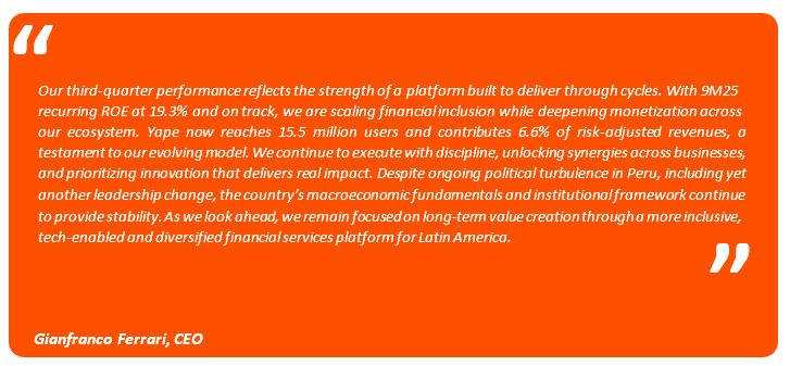 Yape reached 15.5 million Monthly Active Users (MAU), with operating leverage continuing to expand and accounting for 6.6% of Credicorp’s total risk-adjusted revenue.