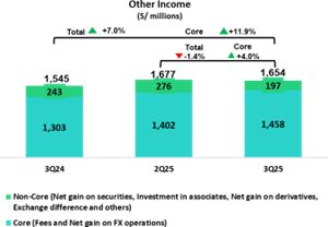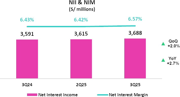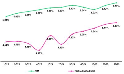 Net interest income (NII) rose 2.7% YoY, driven by a further strengthened funding mix and higher-yielding loan portfolio; and increased 2.0% QoQ. Net Interest Margin (NIM) reached 6.57%, expanding 14 bps YoY and 15 bps QoQ.