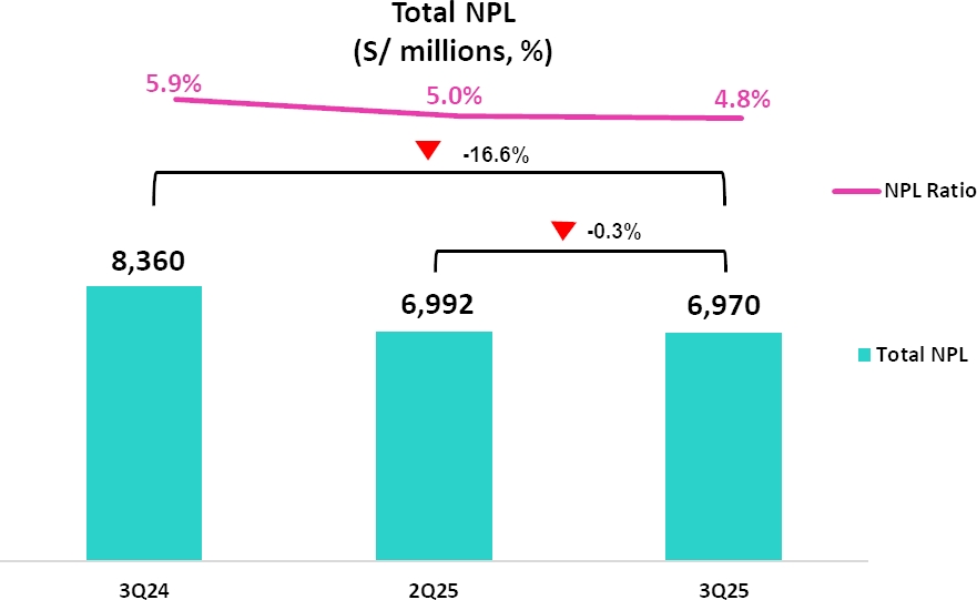 NPL Ratio improved across all segments, declining 105 bps YoY to 4.8%, principally reflecting debt repayments at BCP and a drop in overdue loans at BCP and Mibanco.