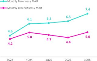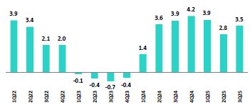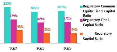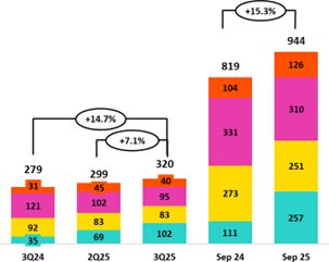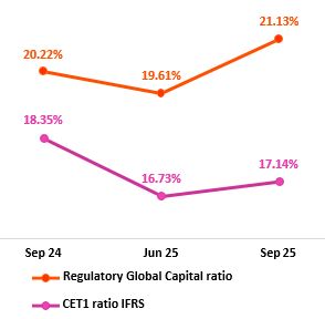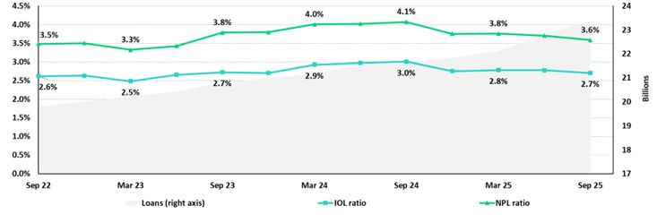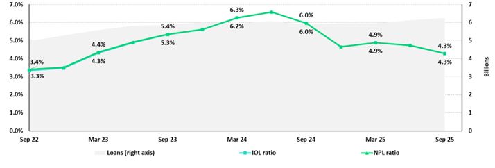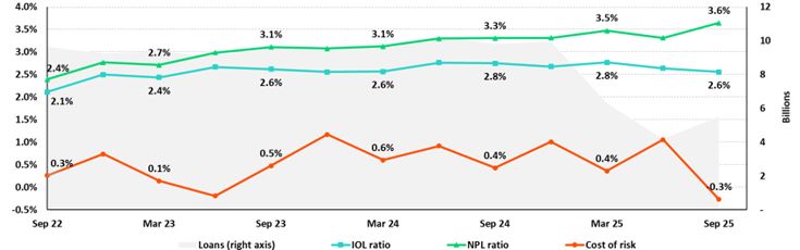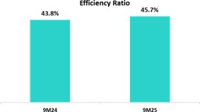 Efficiency ratio at 45.7% for 9M25, on track with full-year guidance. Operating Expenses rose 12.8% YoY in this period,