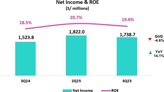 Net income attributable to Credicorp increased 14.1% YoY and declined 4.6% QoQ to S/1,738.7 million, with ROE at 19.6% driven by contributions from all lines of