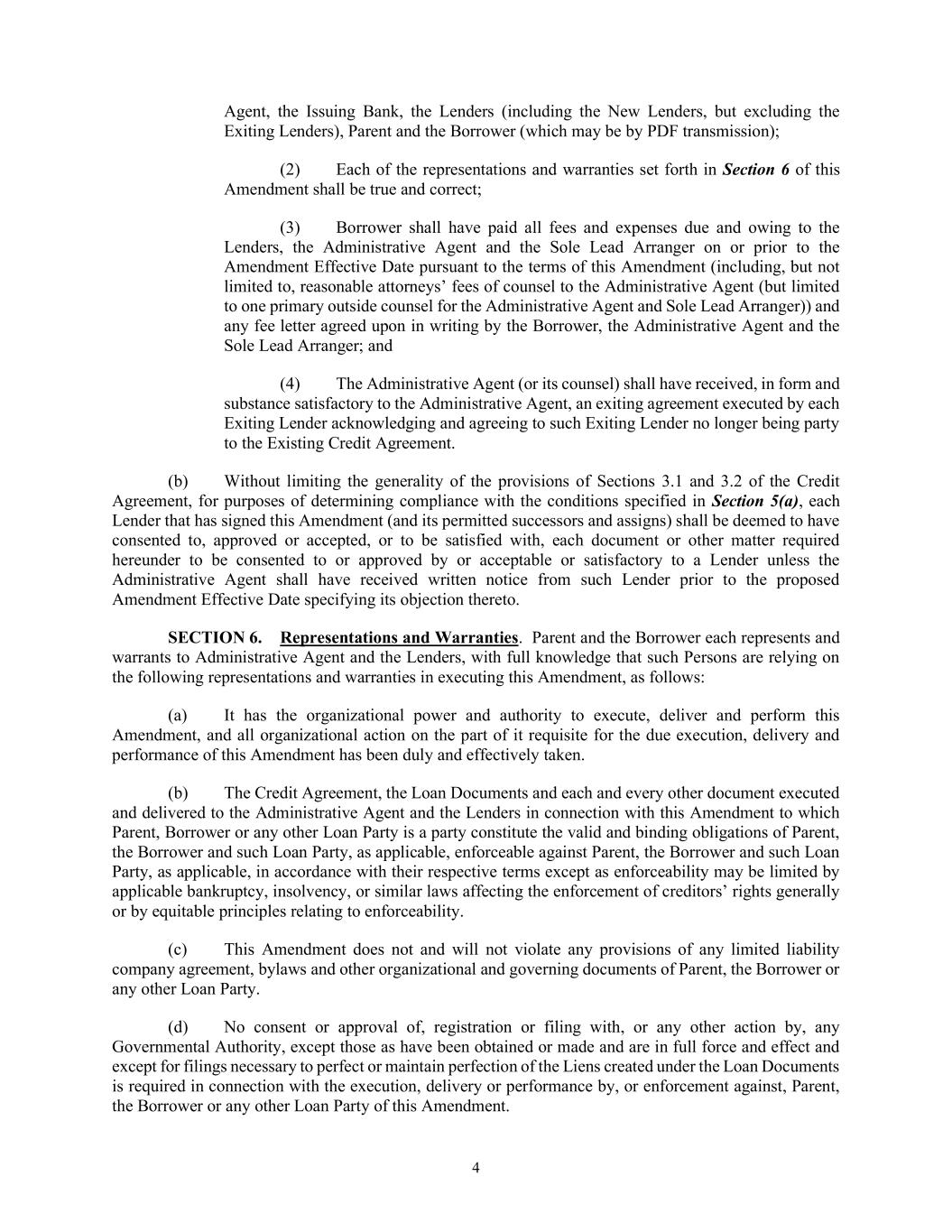 4 Agent, the Issuing Bank, the Lenders (including the New Lenders, but excluding the Exiting Lenders), Parent and the Borrower (which may be by PDF transmission); (2) Each of the representations and warranties set forth in Section 6 of this Amendment shall be true and correct; (3) Borrower shall have paid all fees and expenses due and owing to the Lenders, the Administrative Agent and the Sole Lead Arranger on or prior to the Amendment Effective Date pursuant to the terms of this Amendment (including, but not limited to, reasonable attorneys’ fees of counsel to the Administrative Agent (but limited to one primary outside counsel for the Administrative Agent and Sole Lead Arranger)) and any fee letter agreed upon in writing by the Borrower, the Administrative Agent and the Sole Lead Arranger; and (4) The Administrative Agent (or its counsel) shall have received, in form and substance satisfactory to the Administrative Agent, an exiting agreement executed by each Exiting Lender acknowledging and agreeing to such Exiting Lender no longer being party to the Existing Credit Agreement. (b) Without limiting the generality of the provisions of Sections 3.1 and 3.2 of the Credit Agreement, for purposes of determining compliance with the conditions specified in Section 5(a), each Lender that has signed this Amendment (and its permitted successors and assigns) shall be deemed to have consented to, approved or accepted, or to be satisfied with, each document or other matter required hereunder to be consented to or approved by or acceptable or satisfactory to a Lender unless the Administrative Agent shall have received written notice from such Lender prior to the proposed Amendment Effective Date specifying its objection thereto. SECTION 6. Representations and Warranties. Parent and the Borrower each represents and warrants to Administrative Agent and the Lenders, with full knowledge that such Persons are relying on the following representations and warranties in executing this Amendment, as follows: (a) It has the organizational power and authority to execute, deliver and perform this Amendment, and all organizational action on the part of it requisite for the due execution, delivery and performance of this Amendment has been duly and effectively taken. (b) The Credit Agreement, the Loan Documents and each and every other document executed and delivered to the Administrative Agent and the Lenders in connection with this Amendment to which Parent, Borrower or any other Loan Party is a party constitute the valid and binding obligations of Parent, the Borrower and such Loan Party, as applicable, enforceable against Parent, the Borrower and such Loan Party, as applicable, in accordance with their respective terms except as enforceability may be limited by applicable bankruptcy, insolvency, or similar laws affecting the enforcement of creditors’ rights generally or by equitable principles relating to enforceability. (c) This Amendment does not and will not violate any provisions of any limited liability company agreement, bylaws and other organizational and governing documents of Parent, the Borrower or any other Loan Party. (d) No consent or approval of, registration or filing with, or any other action by, any Governmental Authority, except those as have been obtained or made and are in full force and effect and except for filings necessary to perfect or maintain perfection of the Liens created under the Loan Documents is required in connection with the execution, delivery or performance by, or enforcement against, Parent, the Borrower or any other Loan Party of this Amendment.