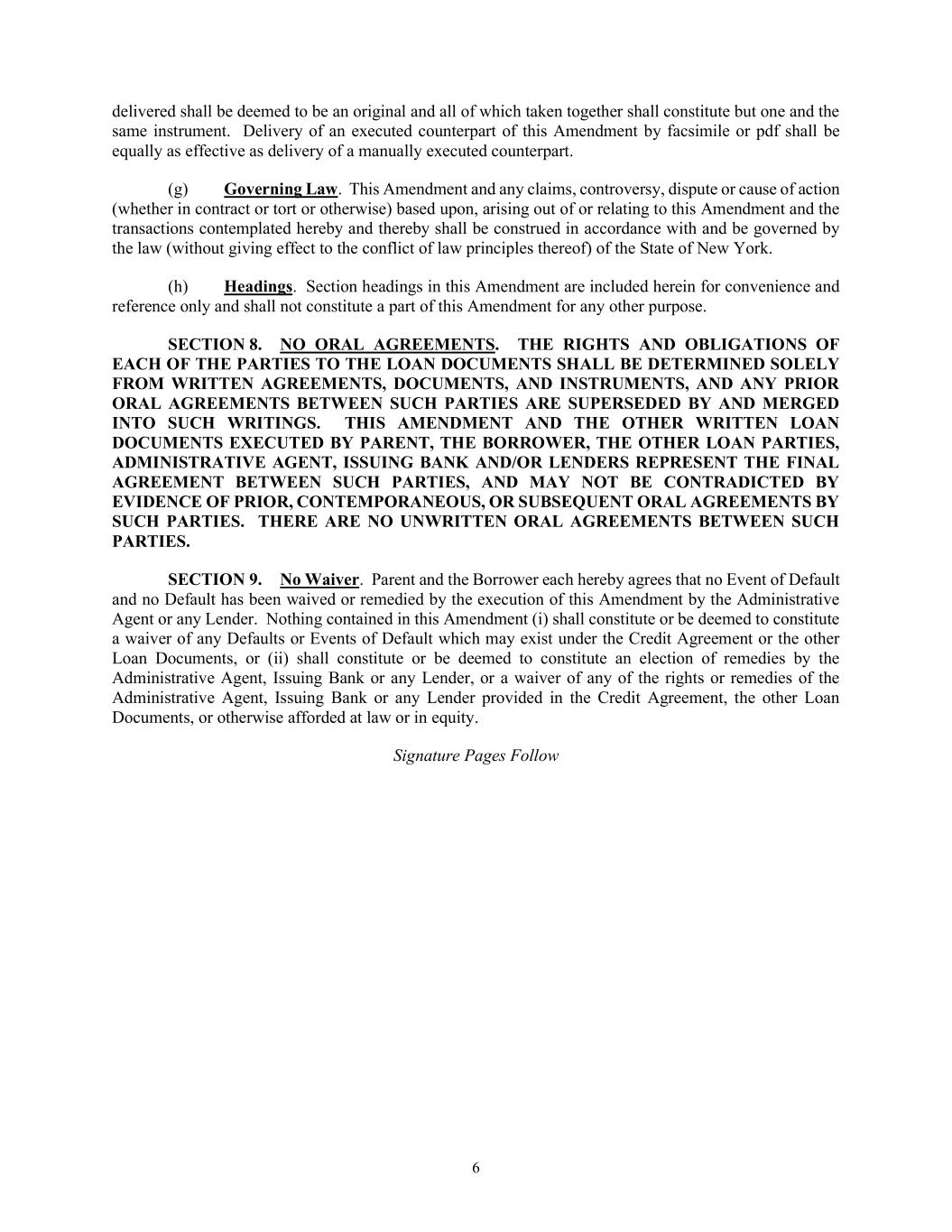 6 delivered shall be deemed to be an original and all of which taken together shall constitute but one and the same instrument. Delivery of an executed counterpart of this Amendment by facsimile or pdf shall be equally as effective as delivery of a manually executed counterpart. (g) Governing Law. This Amendment and any claims, controversy, dispute or cause of action (whether in contract or tort or otherwise) based upon, arising out of or relating to this Amendment and the transactions contemplated hereby and thereby shall be construed in accordance with and be governed by the law (without giving effect to the conflict of law principles thereof) of the State of New York. (h) Headings. Section headings in this Amendment are included herein for convenience and reference only and shall not constitute a part of this Amendment for any other purpose. SECTION 8. NO ORAL AGREEMENTS. THE RIGHTS AND OBLIGATIONS OF EACH OF THE PARTIES TO THE LOAN DOCUMENTS SHALL BE DETERMINED SOLELY FROM WRITTEN AGREEMENTS, DOCUMENTS, AND INSTRUMENTS, AND ANY PRIOR ORAL AGREEMENTS BETWEEN SUCH PARTIES ARE SUPERSEDED BY AND MERGED INTO SUCH WRITINGS. THIS AMENDMENT AND THE OTHER WRITTEN LOAN DOCUMENTS EXECUTED BY PARENT, THE BORROWER, THE OTHER LOAN PARTIES, ADMINISTRATIVE AGENT, ISSUING BANK AND/OR LENDERS REPRESENT THE FINAL AGREEMENT BETWEEN SUCH PARTIES, AND MAY NOT BE CONTRADICTED BY EVIDENCE OF PRIOR, CONTEMPORANEOUS, OR SUBSEQUENT ORAL AGREEMENTS BY SUCH PARTIES. THERE ARE NO UNWRITTEN ORAL AGREEMENTS BETWEEN SUCH PARTIES. SECTION 9. No Waiver. Parent and the Borrower each hereby agrees that no Event of Default and no Default has been waived or remedied by the execution of this Amendment by the Administrative Agent or any Lender. Nothing contained in this Amendment (i) shall constitute or be deemed to constitute a waiver of any Defaults or Events of Default which may exist under the Credit Agreement or the other Loan Documents, or (ii) shall constitute or be deemed to constitute an election of remedies by the Administrative Agent, Issuing Bank or any Lender, or a waiver of any of the rights or remedies of the Administrative Agent, Issuing Bank or any Lender provided in the Credit Agreement, the other Loan Documents, or otherwise afforded at law or in equity. Signature Pages Follow