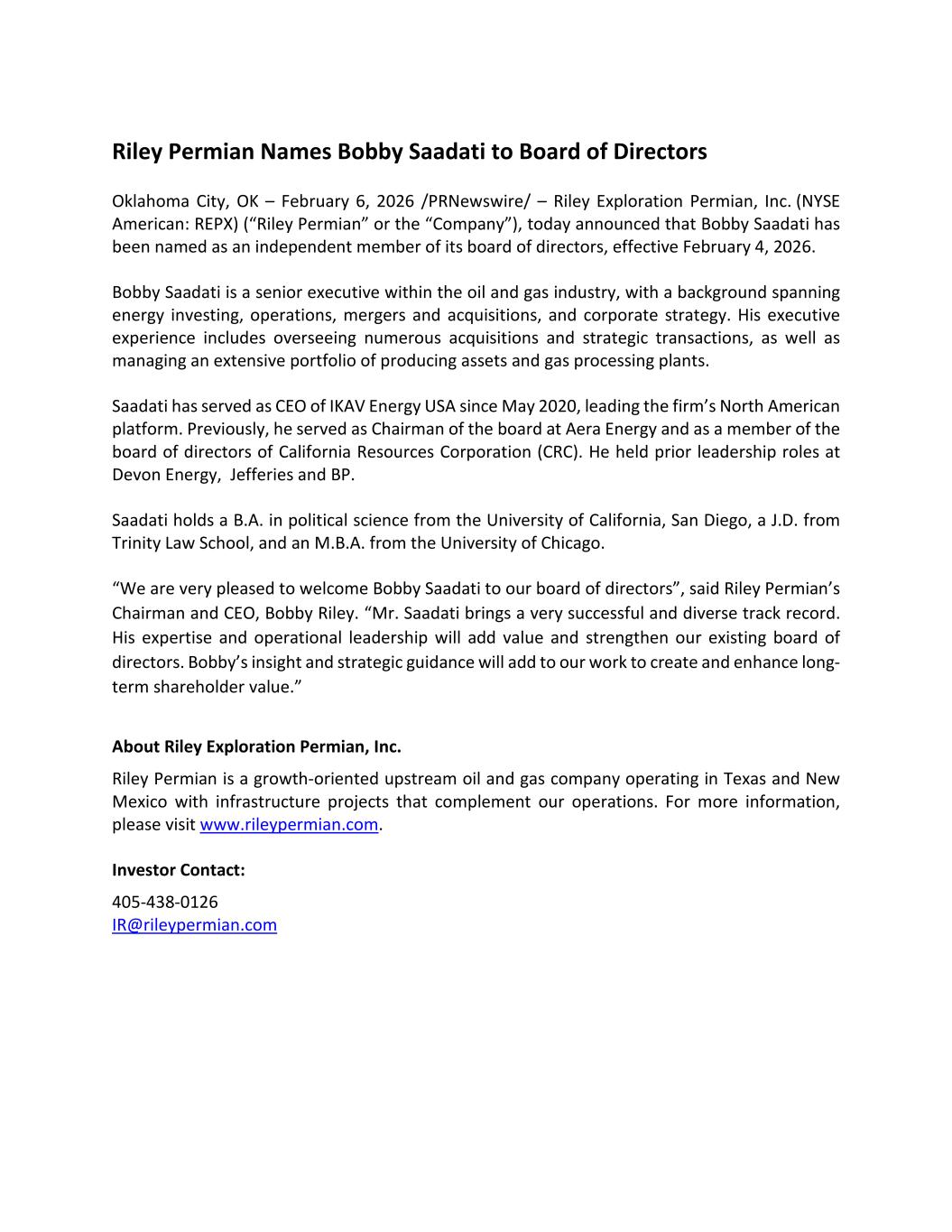 Riley Permian Names Bobby Saadati to Board of Directors Oklahoma City, OK – February 6, 2026 /PRNewswire/ – Riley Exploration Permian, Inc. (NYSE American: REPX) (“Riley Permian” or the “Company”), today announced that Bobby Saadati has been named as an independent member of its board of directors, effective February 4, 2026. Bobby Saadati is a senior executive within the oil and gas industry, with a background spanning energy investing, operations, mergers and acquisitions, and corporate strategy. His executive experience includes overseeing numerous acquisitions and strategic transactions, as well as managing an extensive portfolio of producing assets and gas processing plants. Saadati has served as CEO of IKAV Energy USA since May 2020, leading the firm’s North American platform. Previously, he served as Chairman of the board at Aera Energy and as a member of the board of directors of California Resources Corporation (CRC). He held prior leadership roles at Devon Energy, Jefferies and BP. Saadati holds a B.A. in political science from the University of California, San Diego, a J.D. from Trinity Law School, and an M.B.A. from the University of Chicago. “We are very pleased to welcome Bobby Saadati to our board of directors”, said Riley Permian’s Chairman and CEO, Bobby Riley. “Mr. Saadati brings a very successful and diverse track record. His expertise and operational leadership will add value and strengthen our existing board of directors. Bobby’s insight and strategic guidance will add to our work to create and enhance long- term shareholder value.” About Riley Exploration Permian, Inc. Riley Permian is a growth-oriented upstream oil and gas company operating in Texas and New Mexico with infrastructure projects that complement our operations. For more information, please visit www.rileypermian.com. Investor Contact: 405-438-0126 IR@rileypermian.com