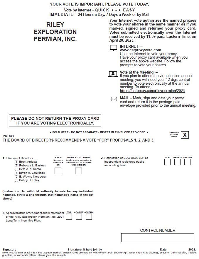 On behalf of the Board of Directors of Riley Exploration Permian, Inc. (“Riley Permian”), we are pleased to invite you to our 2023 Annual Meeting of Stockholders, which will take place on Friday, April 21, 2023 at 10:00 a.m.