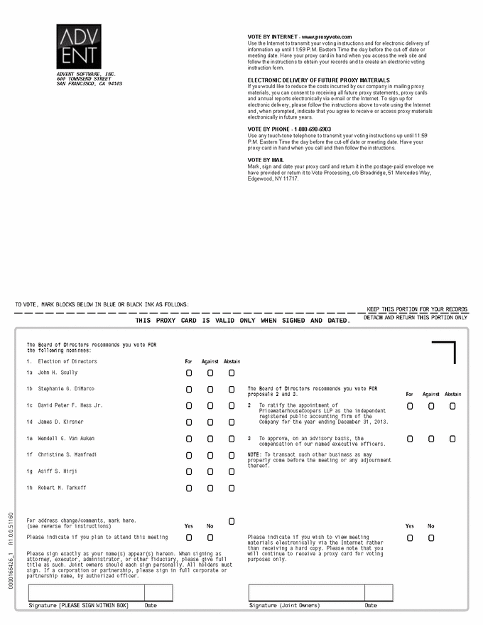 THIS PROXY CARD IS VALID ONLY WHEN SIGNED AND DATED. KEEP THIS PORTION FOR YOUR RECORDS DETACH AND RETURN THIS PORTION ONLY TO VOTE, MARK BLOCKS BELOW IN BLUE OR BLACK INK AS FOLLOWS: Signature (Joint Owners) Signature [PLEASE SIGN WITHIN BOX] Date Date 0 0 0 0 0 0 0 0 0 0 0 0 0 0 0 0 0 0 0 0 0 0 0 0 0 0 0 0 0 0 0 0 0 0 0 0000166426_1 R1.0.0.51160 ADVENT SOFTWARE, INC. 600 TOWNSEND STREET SAN FRANCISCO, CA 94103 VOTE BY INTERNET - www.proxyvote.com Use the Internet to transmit your voting instructions and for electronic delivery of information up until 11:59 P.M. Eastern Time the day before the cut-off date or meeting date. Have your proxy card in hand when you access the web site and follow the instructions to obtain your records and to create an electronic voting instruction form. ELECTRONIC DELIVERY OF FUTURE PROXY MATERIALS If you would like to reduce the costs incurred by our company in mailing proxy materials, you can consent to receiving all future proxy statements, proxy cards and annual reports electronically via e-mail or the Internet. To sign up for electronic delivery, please follow the instructions above to vote using the Internet and, when prompted, indicate that you agree to receive or access proxy materials electronically in future years. VOTE BY PHONE - 1-800-690-6903 Use any touch-tone telephone to transmit your voting instructions up until 11:59 P.M. Eastern Time the day before the cut-off date or meeting date. Have your proxy card in hand when you call and then follow the instructions. VOTE BY MAIL Mark, sign and date your proxy card and return it in the postage-paid envelope we have provided or return it to Vote Processing, c/o Broadridge, 51 Mercedes Way, Edgewood, NY 11717. The Board of Directors recommends you vote FOR the following nominees: For Against Abstain 1. Election of Directors 1a John H. Scully 1b Stephanie G. DiMarco 1c David Peter F. Hess Jr. 1d James D. Kirsner 1e Wendell G. Van Auken 1f Christine S. Manfredi 1g Asiff S. Hirji 1h Robert M. Tarkoff The Board of Directors recommends you vote FOR proposals 2 and 3. For Against Abstain 2 To ratify the appointment of PricewaterhouseCoopers LLP as the independent registered public accounting firm of the Company for the year ending December 31, 2013. 3 To approve, on an advisory basis, the compensation of our named executive officers. NOTE: To transact such other business as may properly come before the meeting or any adjournment thereof. Please sign exactly as your name(s) appear(s) hereon. When signing as attorney, executor, administrator, or other fiduciary, please give full title as such. Joint owners should each sign personally. All holders must sign. If a corporation or partnership, please sign in full corporate or partnership name, by authorized officer. For address change/comments, mark here. (see reverse for instructions) Yes No Please indicate if you plan to attend this meeting Yes No Please indicate if you wish to view meeting materials electronically via the Internet rather than receiving a hard copy. Please note that you will continue to receive a proxy card for voting purposes only. |