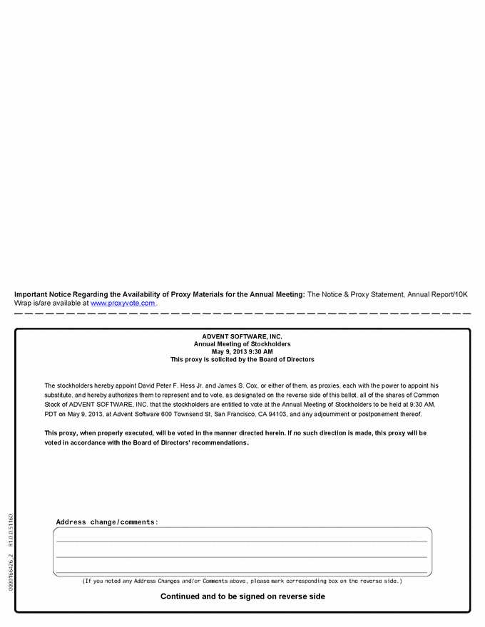 0000166426_2 R1.0.0.51160 Important Notice Regarding the Availability of Proxy Materials for the Annual Meeting: The Notice & Proxy Statement, Annual Report/10K Wrap is/are available at www.proxyvote.com . ADVENT SOFTWARE, INC. Annual Meeting of Stockholders May 9, 2013 9:30 AM This proxy is solicited by the Board of Directors The stockholders hereby appoint David Peter F. Hess Jr. and James S. Cox, or either of them, as proxies, each with the power to appoint his substitute, and hereby authorizes them to represent and to vote, as designated on the reverse side of this ballot, all of the shares of Common Stock of ADVENT SOFTWARE, INC. that the stockholders are entitled to vote at the Annual Meeting of Stockholders to be held at 9:30 AM, PDT on May 9, 2013, at Advent Software 600 Townsend St, San Francisco, CA 94103, and any adjournment or postponement thereof. This proxy, when properly executed, will be voted in the manner directed herein. If no such direction is made, this proxy will be voted in accordance with the Board of Directors' recommendations. (If you noted any Address Changes and/or Comments above, please mark corresponding box on the reverse side.) Address change/comments: Continued and to be signed on reverse side |