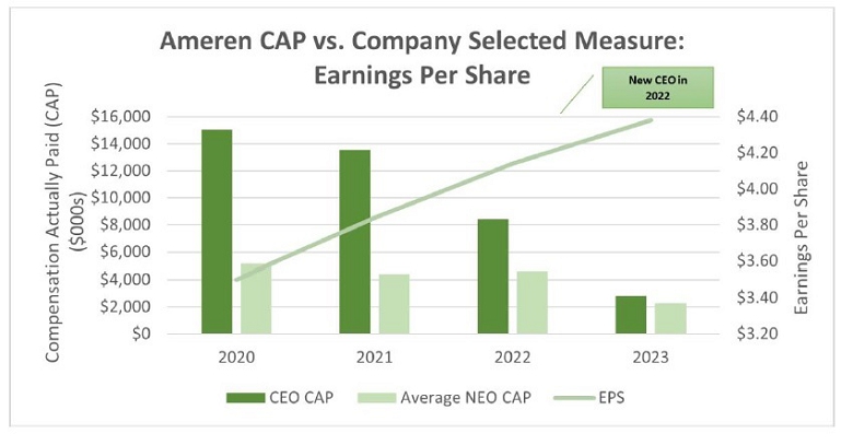 The most important annual financial measure that the Company uses to link pay to performance is the Company's annual EPS, which is not only the most heavily weighted metric in the STIP, but also generally consistent with Ameren’s TSR, which is the most heavily weighted performance metric in the Company's LTIP. As shown in the chart below, the Company's EPS increased by 9.7% between 2020 and 2021, while the CEO and Average NEO CAP decreased by 10% and 14.9%, respectively, for the same period. In 2022, while the Average NEO CAP increased by 5.3% and the CEO CAP decreased by 37.9%, driven primarily by the appointment of a new CEO effective January 1, 2022, the Company's EPS increased by 7.8%. In 2023, while the CEO CAP and the Average NEO CAP decreased by 66.6% and 49.1% respectively, driven primarily by the impact on the fair value of outstanding equity awards of the fourth quarter 2023 Ameren stock price decline as a result of the unfavorable regulatory outcomes in Ameren Illinois’ natural gas and multi-year electric distribution rate review and grid plan proceedings, the Company's EPS increased by 5.8%.