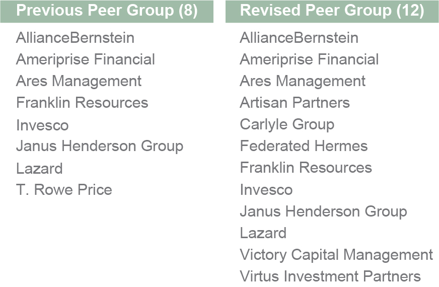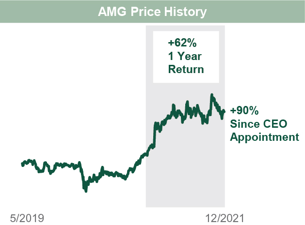 • CEO holds shares of AMG stock that significantly exceed the required level, having purchased 52,000 shares in the open market since appointment as CEO, across seven distinct purchases, totaling $4.2 million notional value at time of purchase • Over the past two years, other named executive officers have purchased over 7,000 shares, with an aggregate notional value of more than $1 million at the time of purchase |
